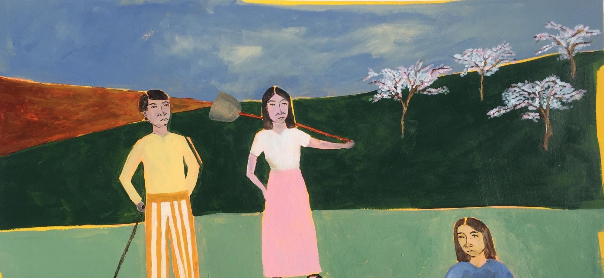 He’s inspired not just by the stories of those he meets on his travels, but by those of his diverse and multicultural family too. His global lens of reference points gives his work a peaceful placelessness. “The scenes are invented, but everything is informed by people I’ve met, or things I’ve seen and experienced,” he says. He paints each piece spontaneously, never taking pencil to canvas to plot out a piece. “I never know what’s going to happen when I start a new work… but each painting is a manifestation of everything so far.”