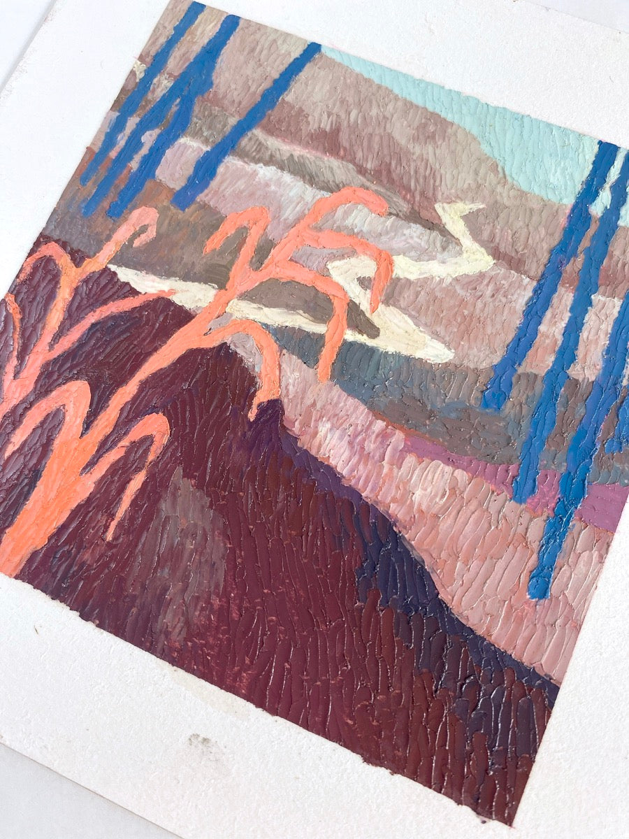 “Nature has always been a muse in my works; the mountain and the sky, the trees and the moon. These elements are frequent collaborators in my exploration. Then comes the chairs, as these new kids on the block. I have piles of baking paper that are dedicated to sketches of chairs. Though I love to capture a setting, a moment, and tones, it also becomes fundamental to infuse a narrative into my work. The imagined narrative is what amused me to explore more into their world." — Ifada Nisa