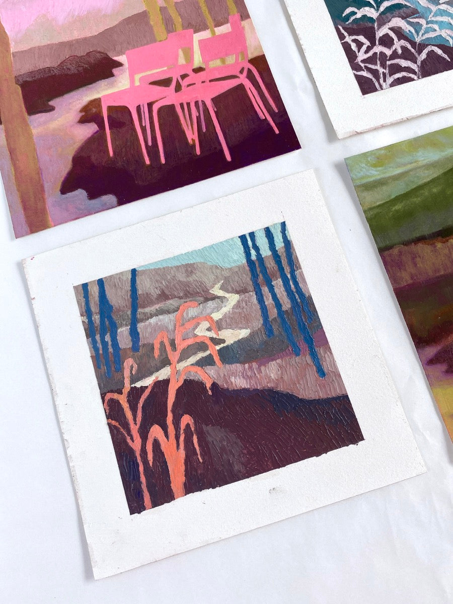 Ifada Nisa is a self-taught artist based in Indonesia. Her degree in Architecture has shaped how she views spaces, both literally and metaphorically. Chairs and landscapes feature as the two predominant subjects in her work, both signifying a space inhabited by humans. The two interweave to create a setting that echoes the stillness and emptiness of spaces, capturing a moment that is made by humans, lived by humans and then left by humans too. She sees her work as a tool to communicate with her inner world and relay to the viewer through the means of storytelling.