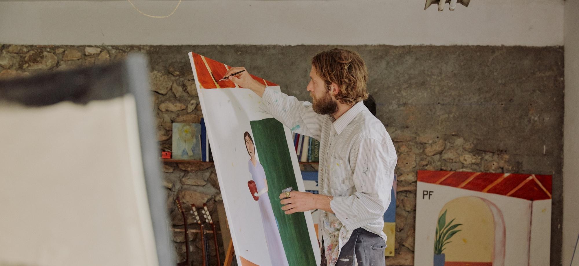 Currently renovating a secluded property in rural Spain by hand, and taking care of all the cats and dogs and birds, of the fish and the vegetables, painting what he builds and building what he paints, Joshua is present. There is a stillness and belonging to these paintings that binds them to his new home, to him, to how and where he is living.