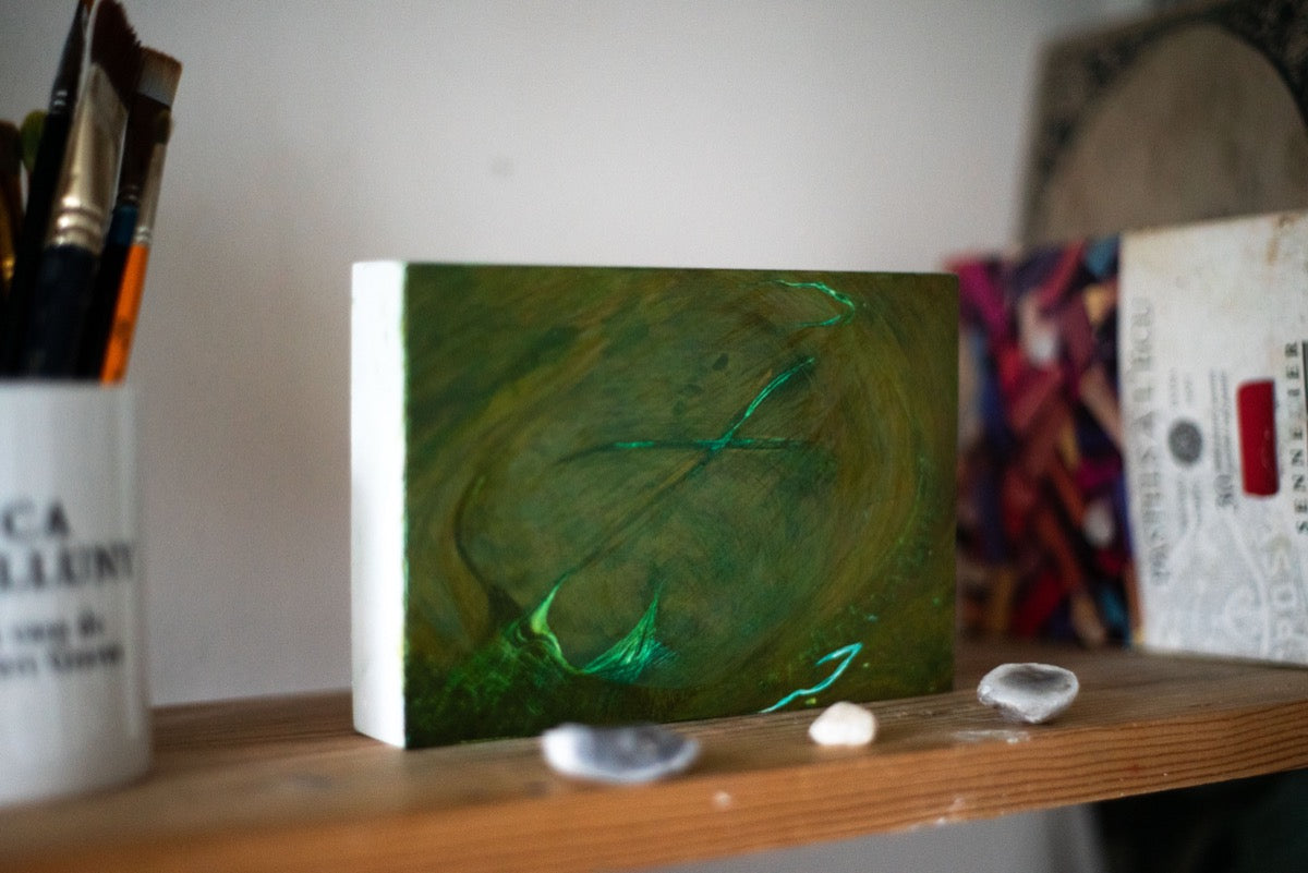 Grace Crabtree is an artist based in Bridport, West Dorset. Her paintings, often using the ancient techniques of egg tempera and buon fresco, are rooted in landscape, water, and deep time – drawing in particular from the coastlines and hills of Dorset and Cyprus, and unearthing the geological and mythological narratives of these terrains.