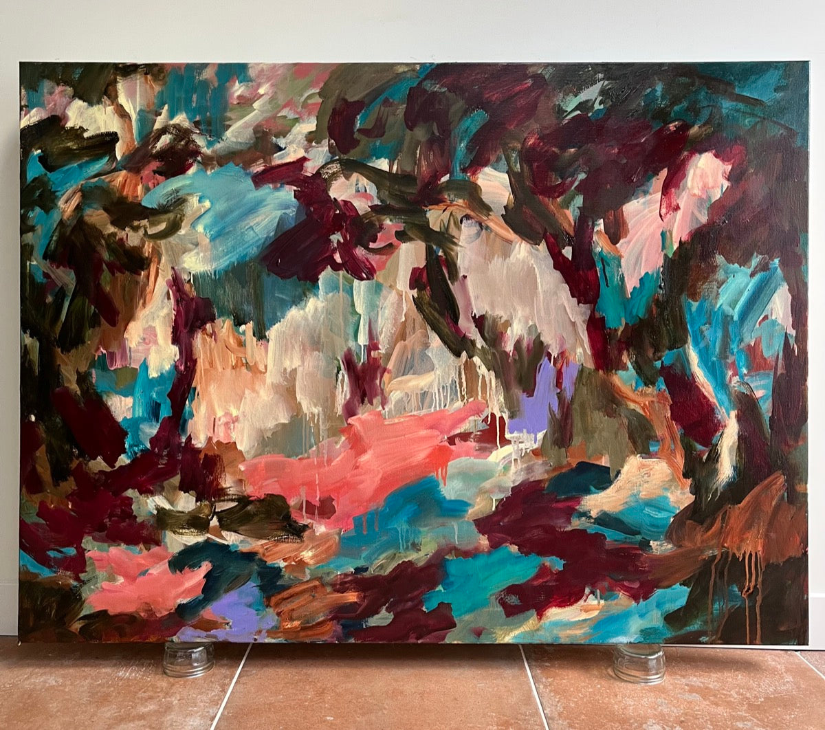 Mary works in oils, allowing the paint to take on a life of its own through chance accidents and gestural mark making. She paints quickly and intuitively, creating a sense of movement while building layers.