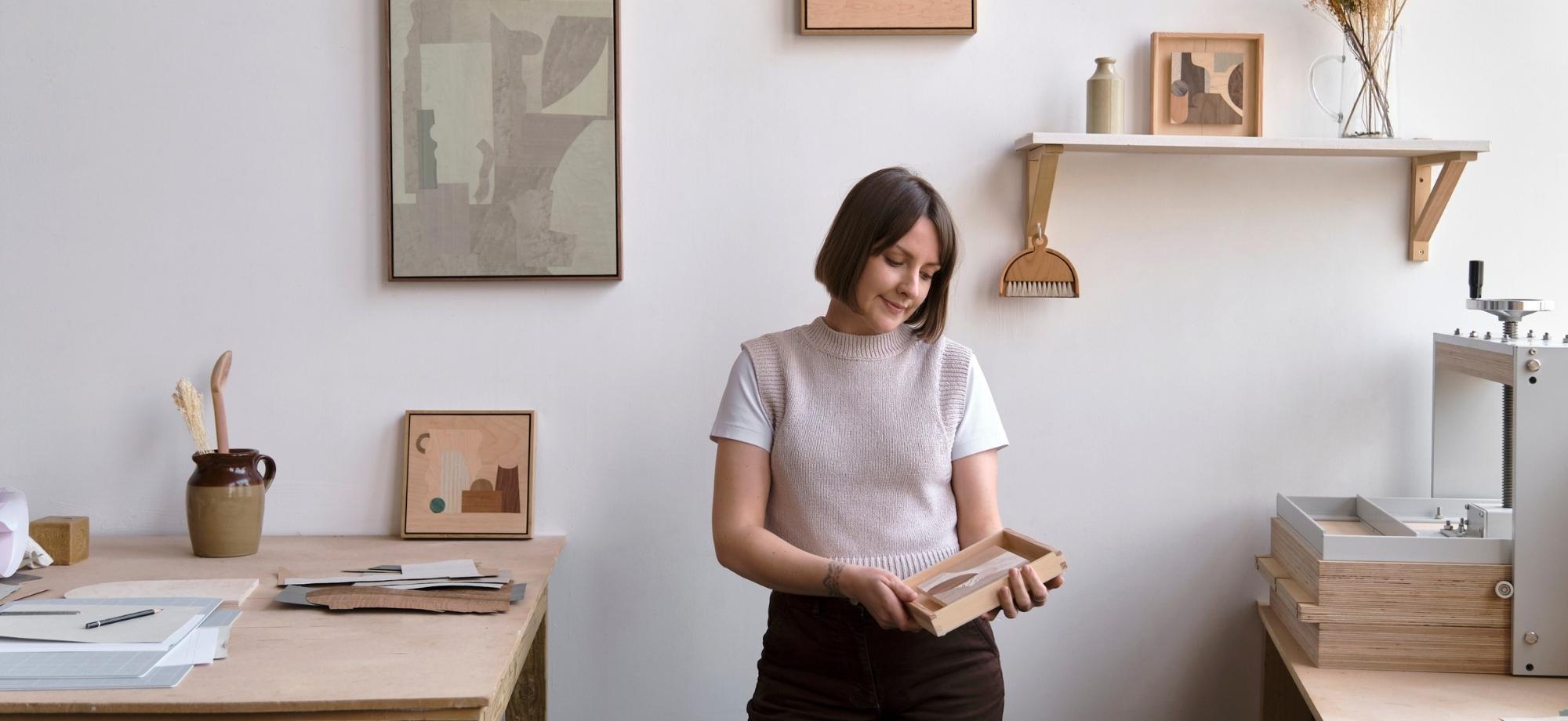 "My work makes light of the beautiful textures and patterns of wood grain. I want the audience to get up close and explore the details of the pieces. I’m bringing to life small offcuts of wood and allowing them to stand out and be appreciated by the viewer. I aim for the colours and shapes to bring a sense of balance to a room, I hope that my pieces are both calming and stimulating at the same time."