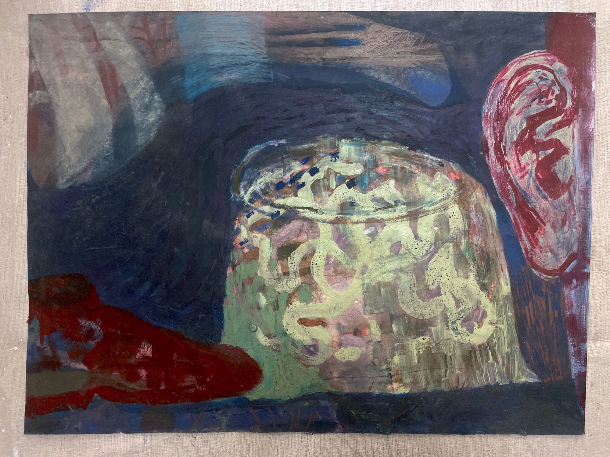 “My practice begins with writing, ink smudges, and drawing. I find comfort in giving life to these fragments - translating them into unexpected yet intimate places. I like to think of myself as a magpie with imagery, gathering accessible symbols that culminate in a narrative-rich world where more waits to be uncovered beneath its surface." - Rebecca Ashton