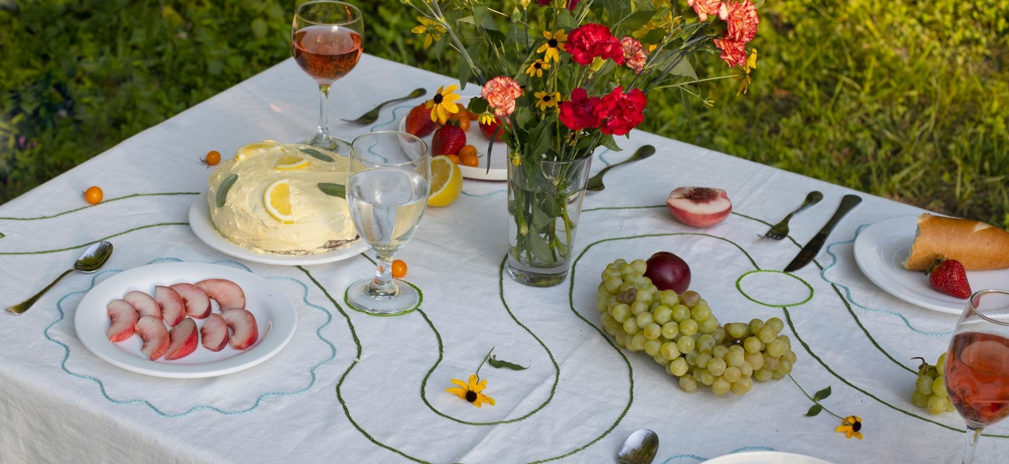 Kicking off the series is collage artist and interior designer, Ruby Kean, who has selected photographer and set-designer Jill Burrow. The pair had been long time fans of each others work, and recently collaborated on a photoshoot that depicted dream-like picnic scenes that were the perfect form of escapism in lockdown. The imagery (featured throughout this piece) displays Ruby's hand-stitched table linens, which are seen adorned with Jill's signature playful food installations that you may well recognise from her cult instagram following.