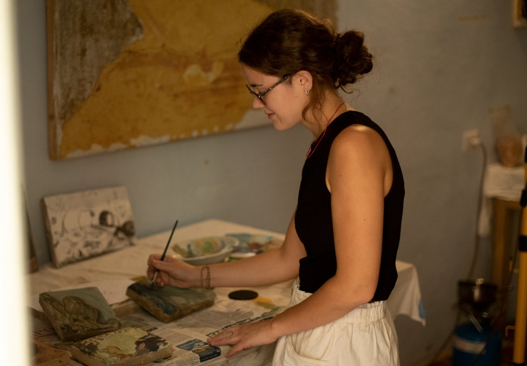Since graduating from the Ruskin School of Art in 2019, Grace has exhibited across the UK. Her debut solo show, Elemental Drift, was held at Bridport Arts Centre in 2024 following ‘The Art of Fresco’, a studio and research project (2022-23). She has attended artist residencies in France, Portugal, and Cyprus, and has recently completed the Turps Correspondence Course.