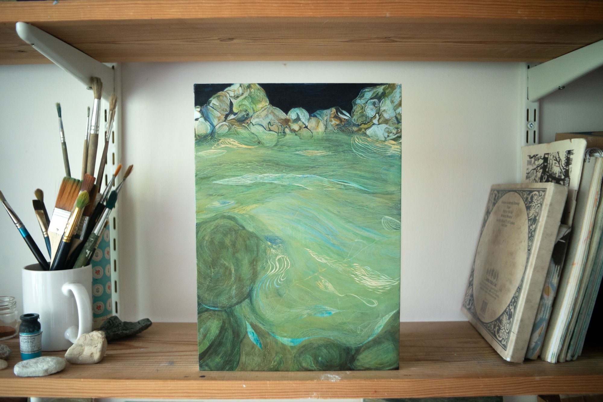 Grace Crabtree is an artist based in Bridport, West Dorset. Her paintings, often using the ancient techniques of egg tempera and buon fresco, are rooted in landscape, water, and deep time – drawing in particular from the coastlines and hills of Dorset and Cyprus, and unearthing the geological and mythological narratives of these terrains.