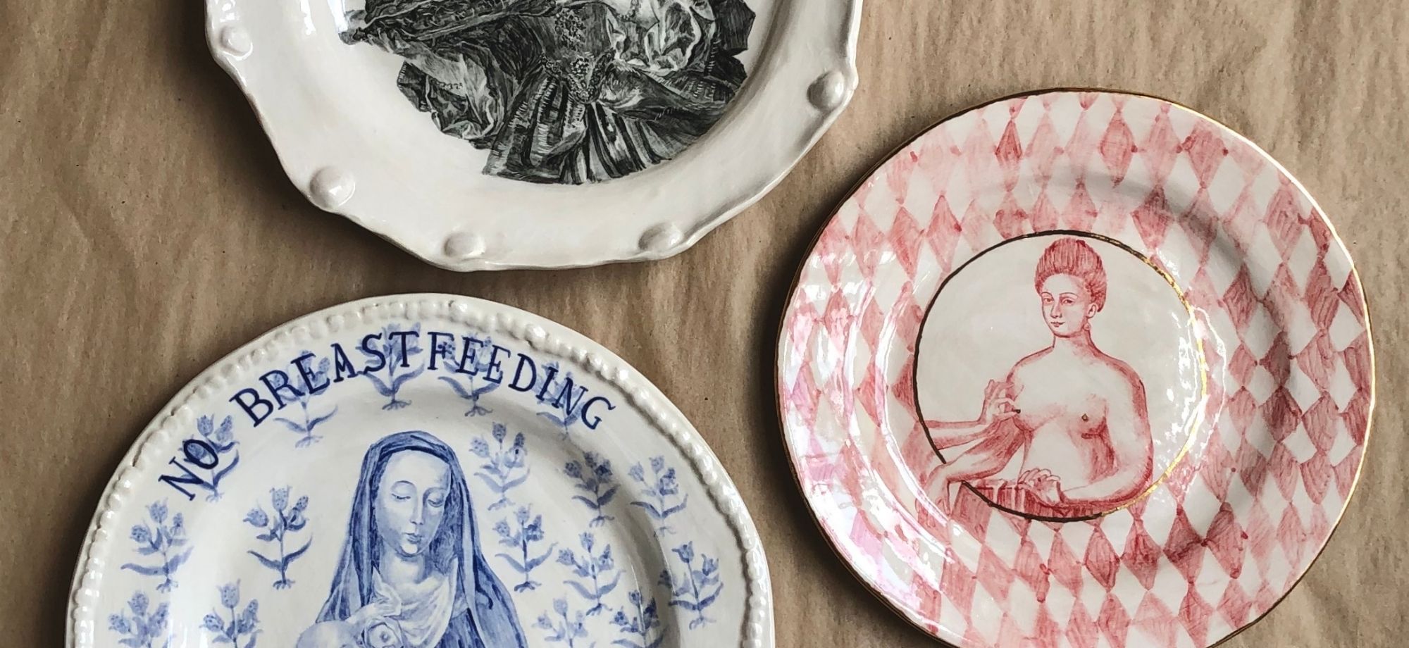 My initial influence when starting ceramics was English delftware with its decorative but simple blue and white designs. I like the idea of portraying women like Frances Andrews from Thomas Gainsborough’s ‘Mr. and Mrs. Andrews’, or Queen Mariana by Velasquez, on a plate that could be made around the same time these were painted in the 17th/18th century, in a juxtaposition with modern themes.