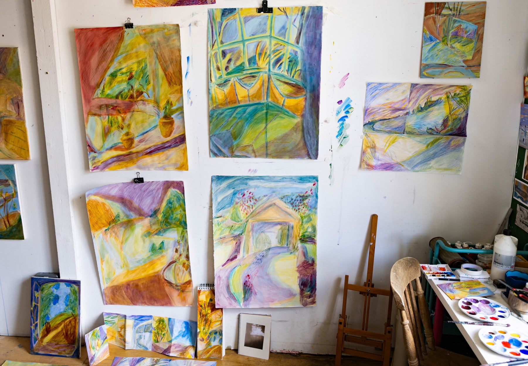 "This collection is a series of drawings and paintings from a combination of observation and memory. I created a series of drawings mostly on site in Kew Gardens and worked from these in the studio, reimagining the colours from memory. The result is a series of layered and textured pieces that were erased and redrawn over multiple times to show a shifting scene." - Several Gardens, Isabel Garfield
