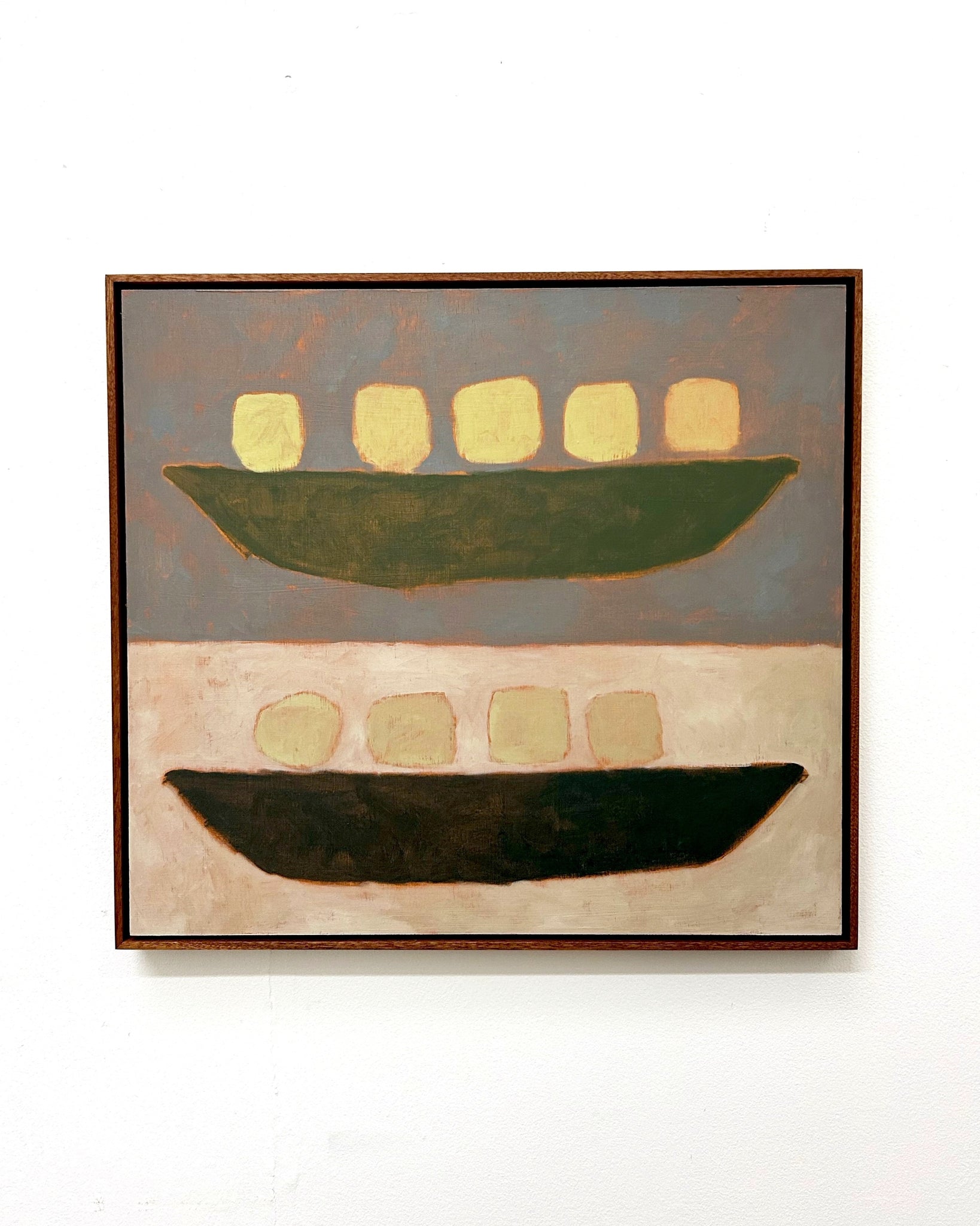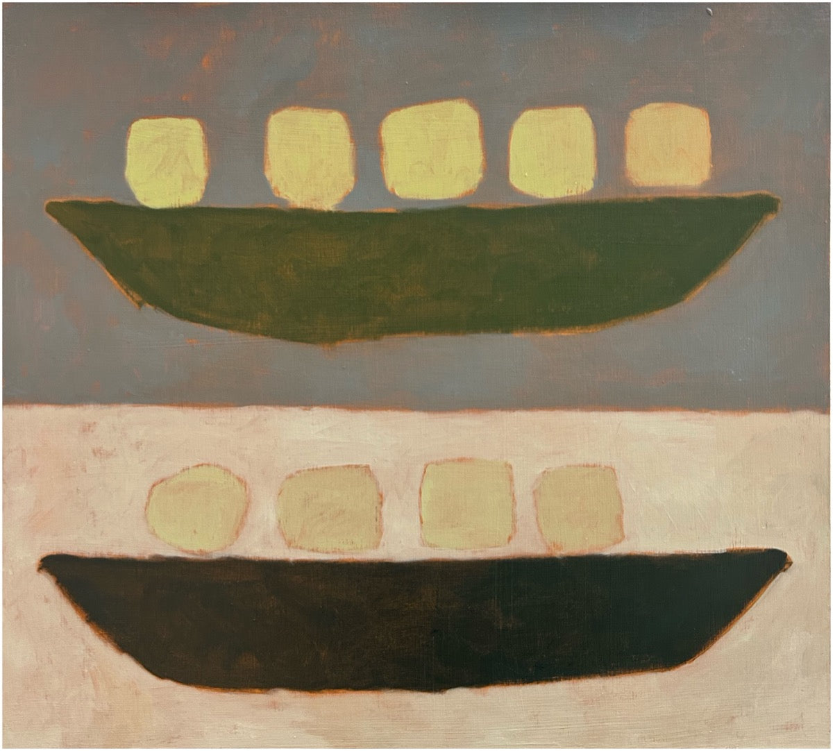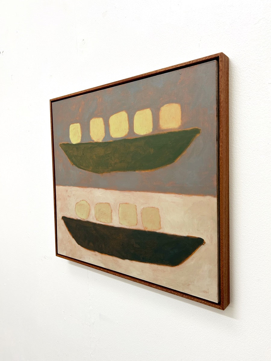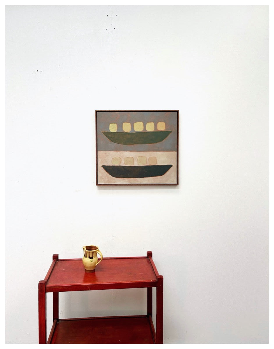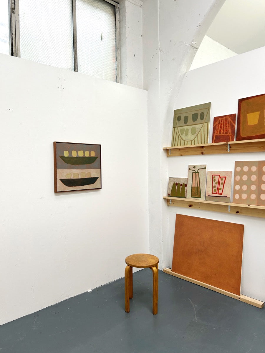 Jay Harper is a British painter based in Bristol, England. Instinctively focused on capturing a feeling, Jay will often use different methods of painting depending on mood. Sometimes painting from a direct reference and other times planning an idea in her mind, and letting that come through in a more free-form spirit. She has a great fondness of muted colour and shape, which are both the foundations of her artworks. Painting with oil onto wood, Jay will often wipe away paint she’s applied to reveal pre-primed colours, playing with the idea of when a work is finished, ever careful to not paint past the feeling.