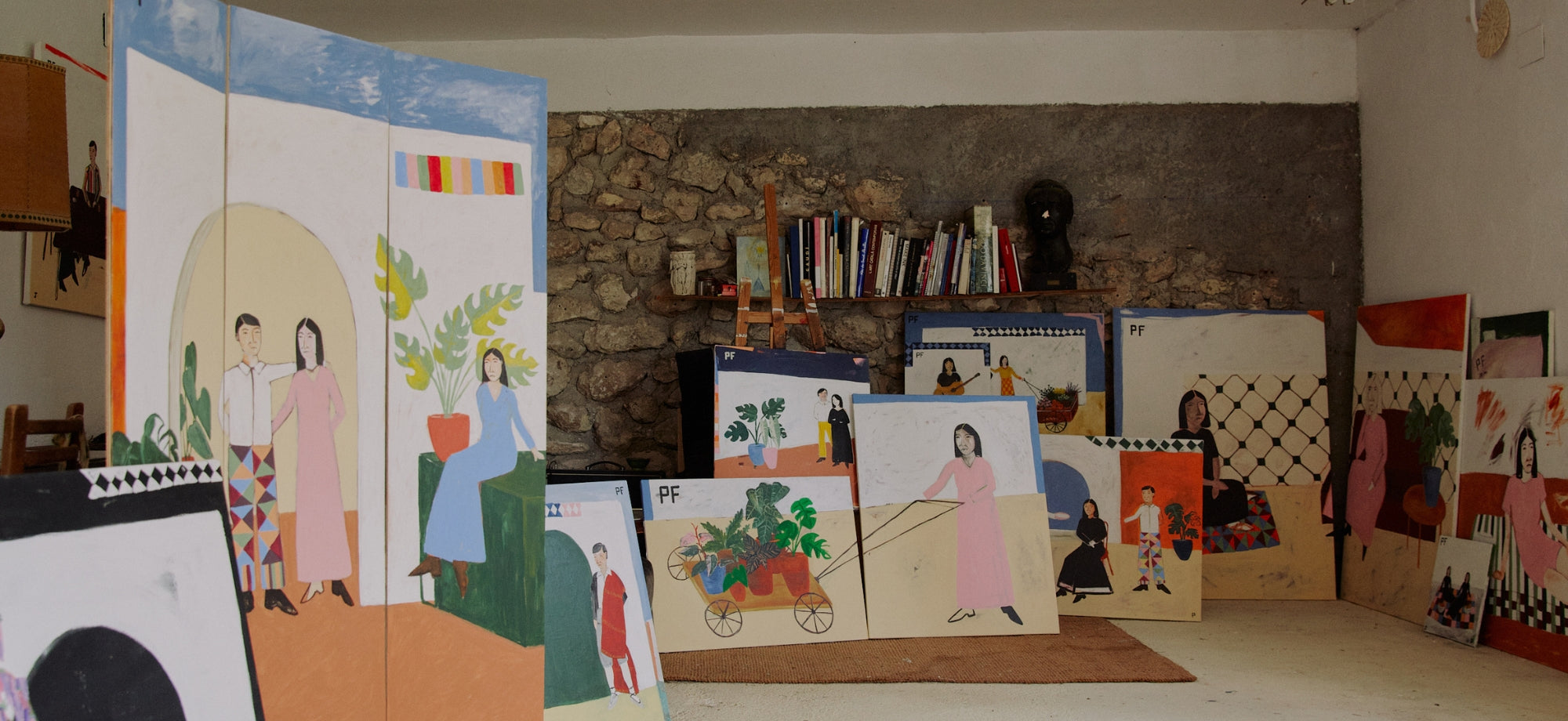 A myriad of abstracted visual references taken from all over the world merge into the painter’s imagined scenes, leaving us with a diverse yet distinctive painted universe, generally void of any factual representation of a certain geographical location or people, rather creating a unique painted universe within itself.
