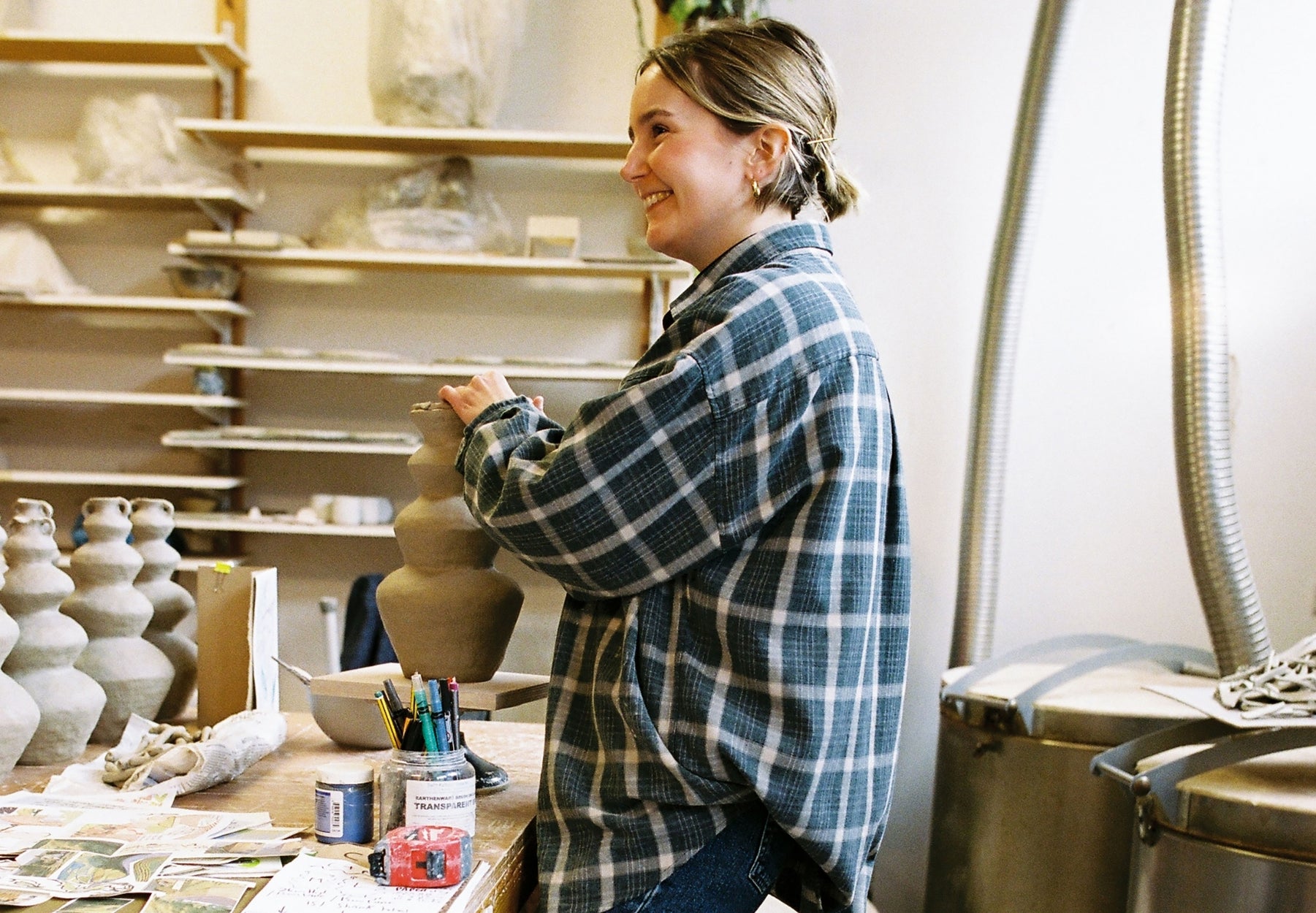 Katie Moore is a London-based ceramic artist whose practice is rooted in hand-building and painting. She discovered her preferred way of making while working remotely in a makeshift studio, where the freedom of coiling by hand allowed space for reflection and experimentation.