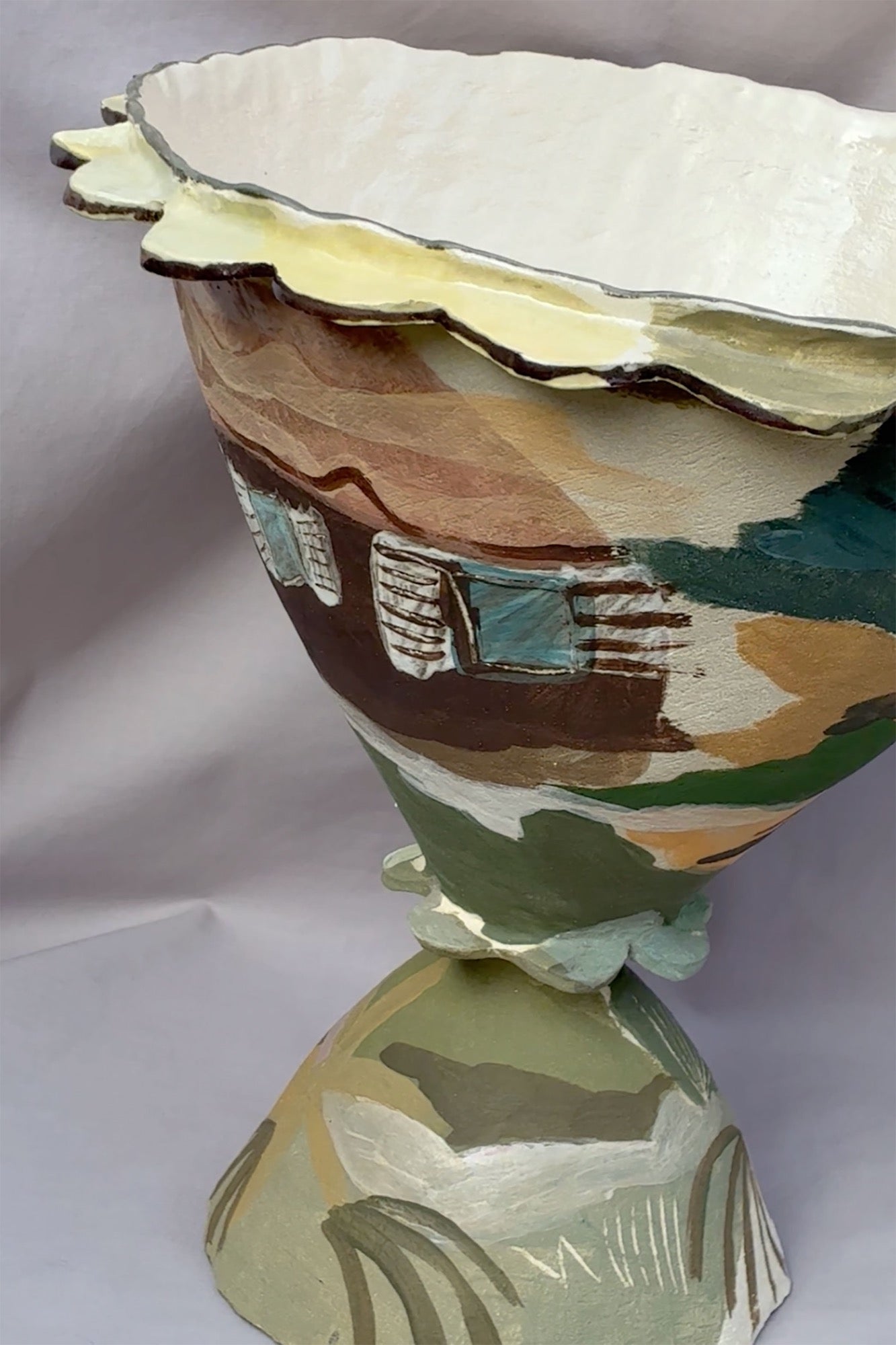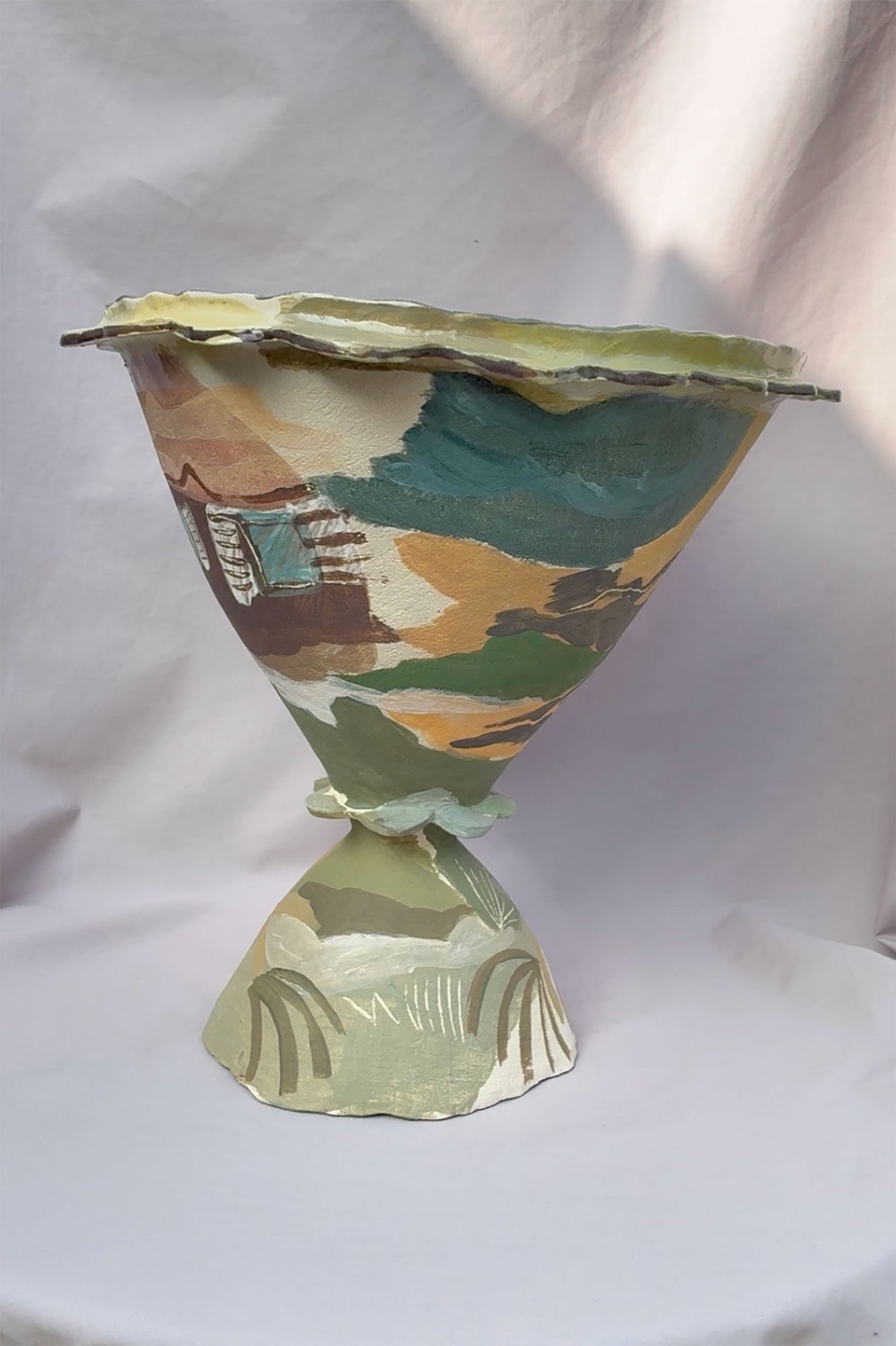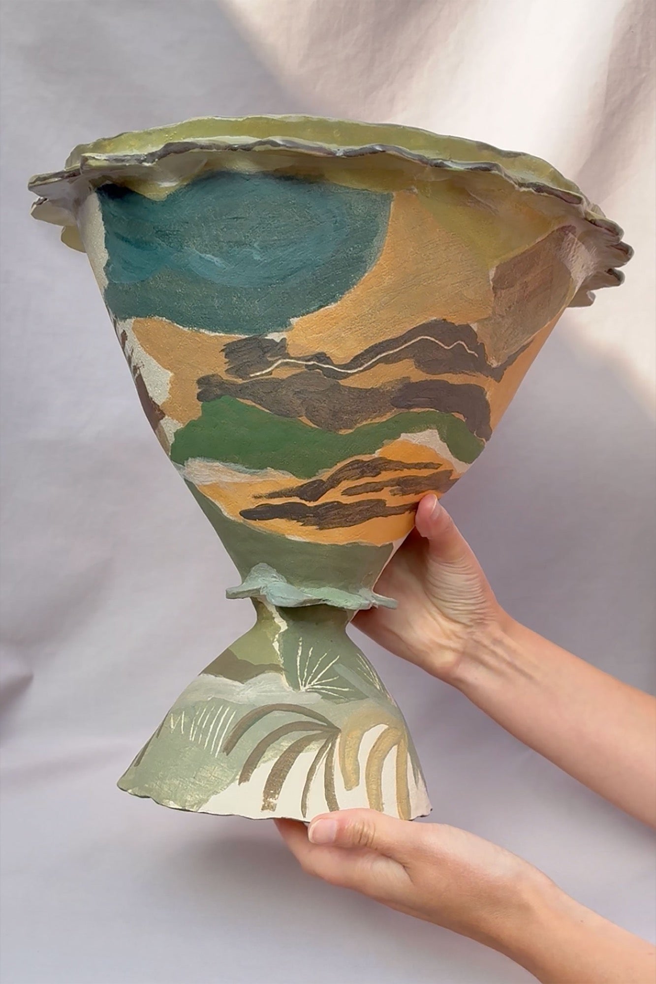 Her work draws on a background in illustration and an ongoing interest in stage sets and landscapes, with each piece conceived as both vessel and prop. Sketches - made by hand and digitally - form the basis for her painted surfaces, which she develops through layers of underglaze and slip in a process she describes as ‘an ongoing experiment’.