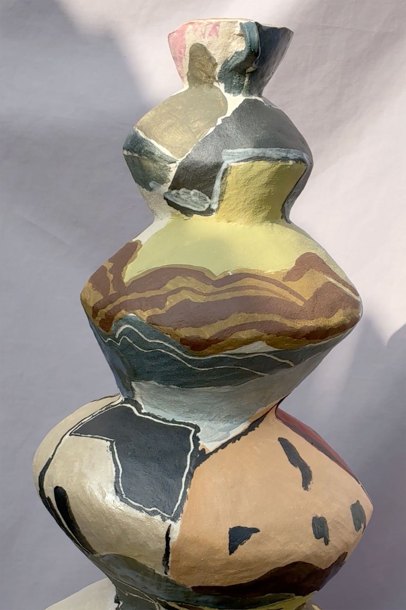 Katie Moore is a London-based ceramic artist whose practice is rooted in hand-building and painting. She discovered her preferred way of making while working remotely in a makeshift studio, where the freedom of coiling by hand allowed space for reflection and experimentation.