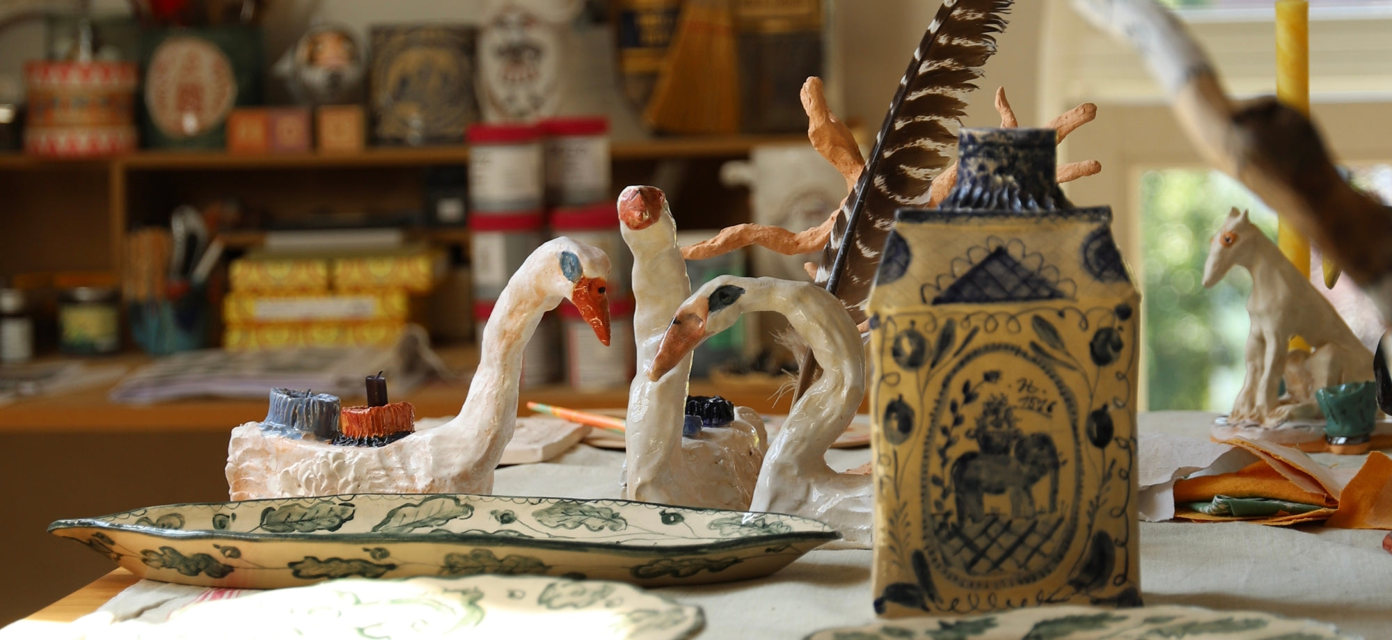 "Living close to the Netherlands, I do get to see a lot of Delft tiles which I love. Some of them have been in the same building for more than 100 years, they have seen people come and go. What secrets could they tell us if they spoke? Will the tiles in our hallways today still be there in 100 years? I would like to honor the single tile and let it tell its story. I used the sgraffito technique because drawing images with a fine needle to make another color of clay appear is a beautiful poetic process. It is also a process tied to time: you have to be done before the surface is dry." — Lisa Sandner, T is for Time