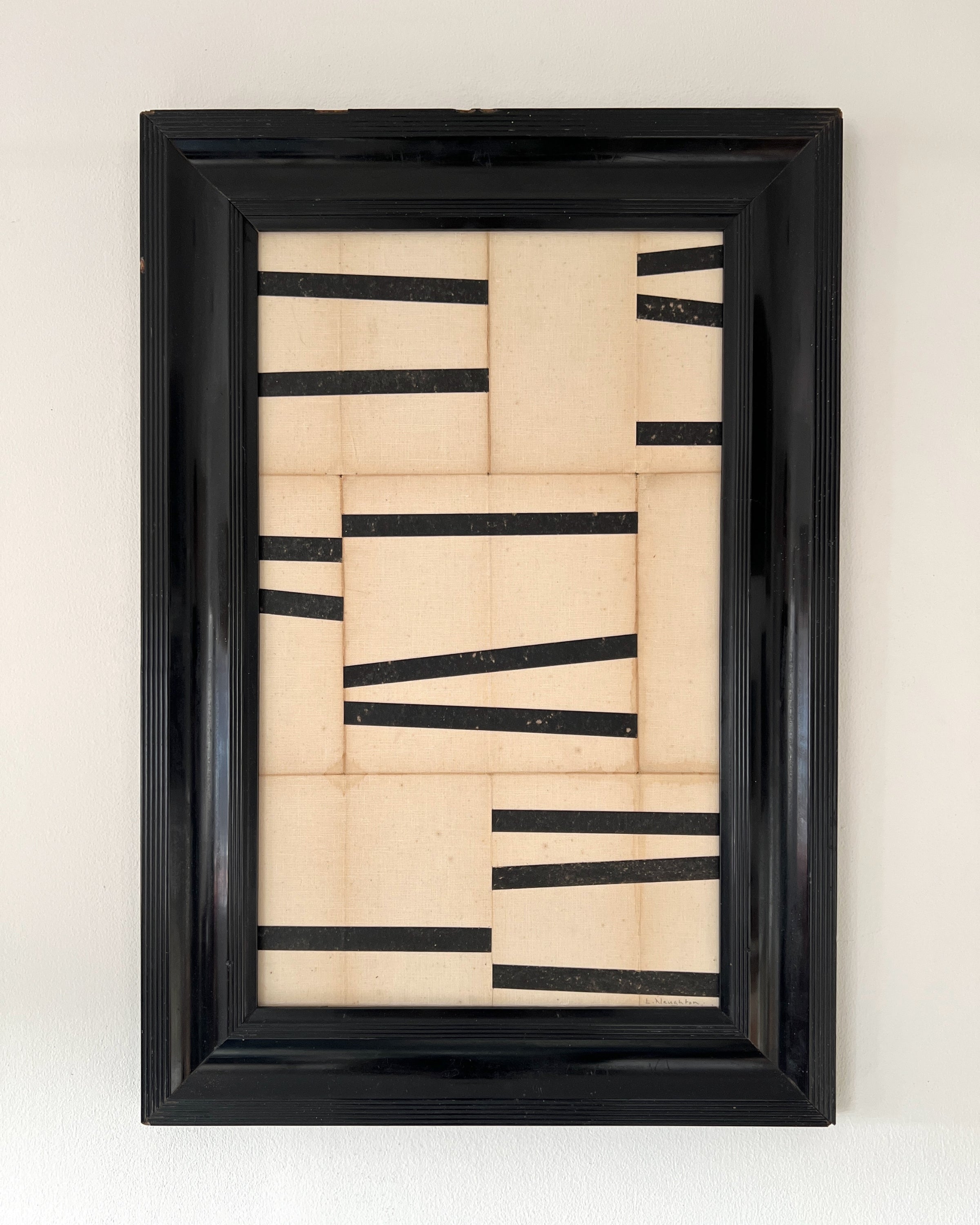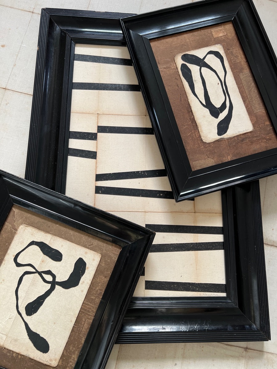Mixed media artist Lucy Naughton takes inspiration from the collected materials that fill her home. In the sorting and arranging of antique frames, books, and papers, abstract paintings and collages come together in an intuitive way, forming collections that sit happily together or individually. The signs of age and imperfections in the materials used are embraced and make each piece totally unique.