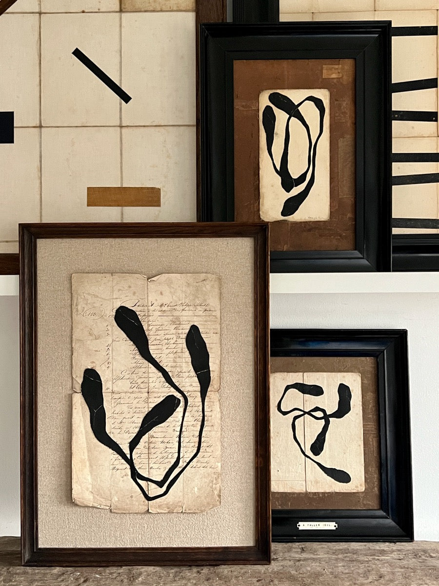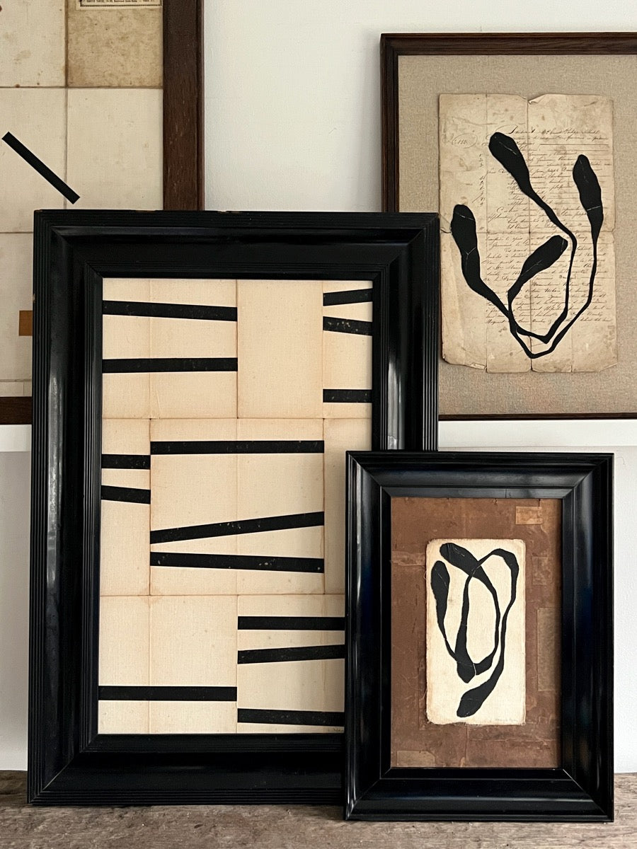 Mixed media artist Lucy Naughton takes inspiration from the collected materials that fill her home. In the sorting and arranging of antique frames, books, and papers, abstract paintings and collages come together in an intuitive way, forming collections that sit happily together or individually. The signs of age and imperfections in the materials used are embraced and make each piece totally unique.