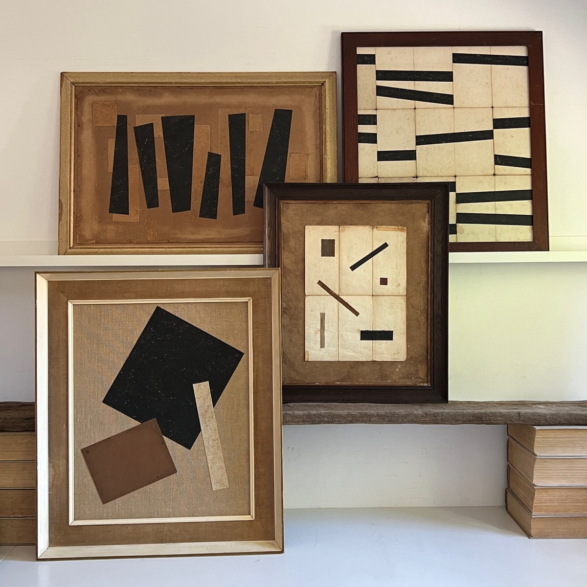 Mixed media artist Lucy Naughton takes inspiration from the collected materials that fill her home. In the sorting and arranging of antique frames, books, and papers, abstract paintings and collages come together in an intuitive way, forming collections that sit happily together or individually. The signs of age and imperfections in the materials used are embraced and make each piece totally unique.