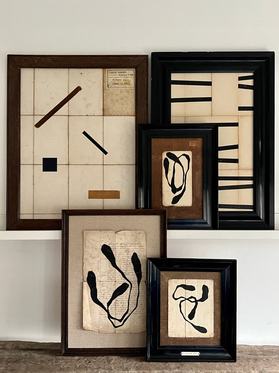 Mixed media artist Lucy Naughton takes inspiration from the collected materials that fill her home. In the sorting and arranging of antique frames, books, and papers, abstract paintings and collages come together in an intuitive way, forming collections that sit happily together or individually. The signs of age and imperfections in the materials used are embraced and make each piece totally unique.
