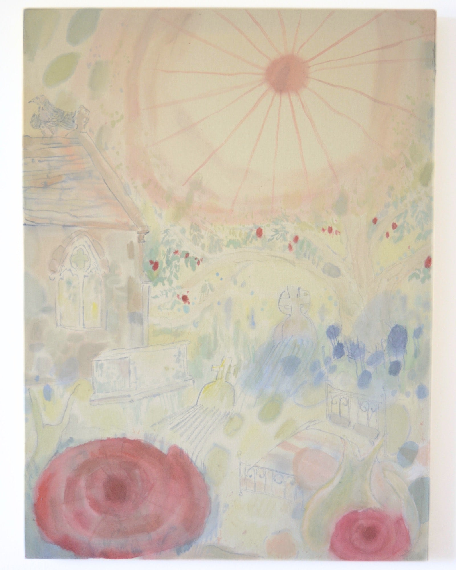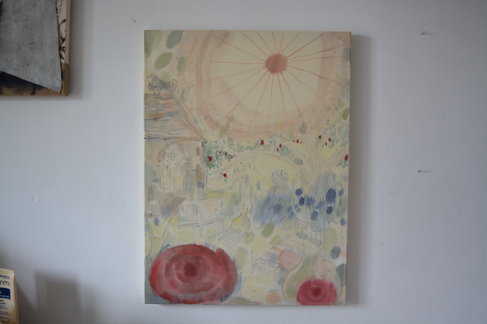 Drawing from queer ecology, magic, and folk tales tied to land justice, anti-war and anti-colonial movements, Bethenie advocates for a 're-enchanting,' 're-wilding' or 're-witching' of land through their work. Often using found materials, they adorn yellowed or worn surfaces with landscapes and animals, processing thoughts about desire and death, and catholicism and animism. Characters such as moths, sheep, chairs, flowers and hillsides often feature in their work.