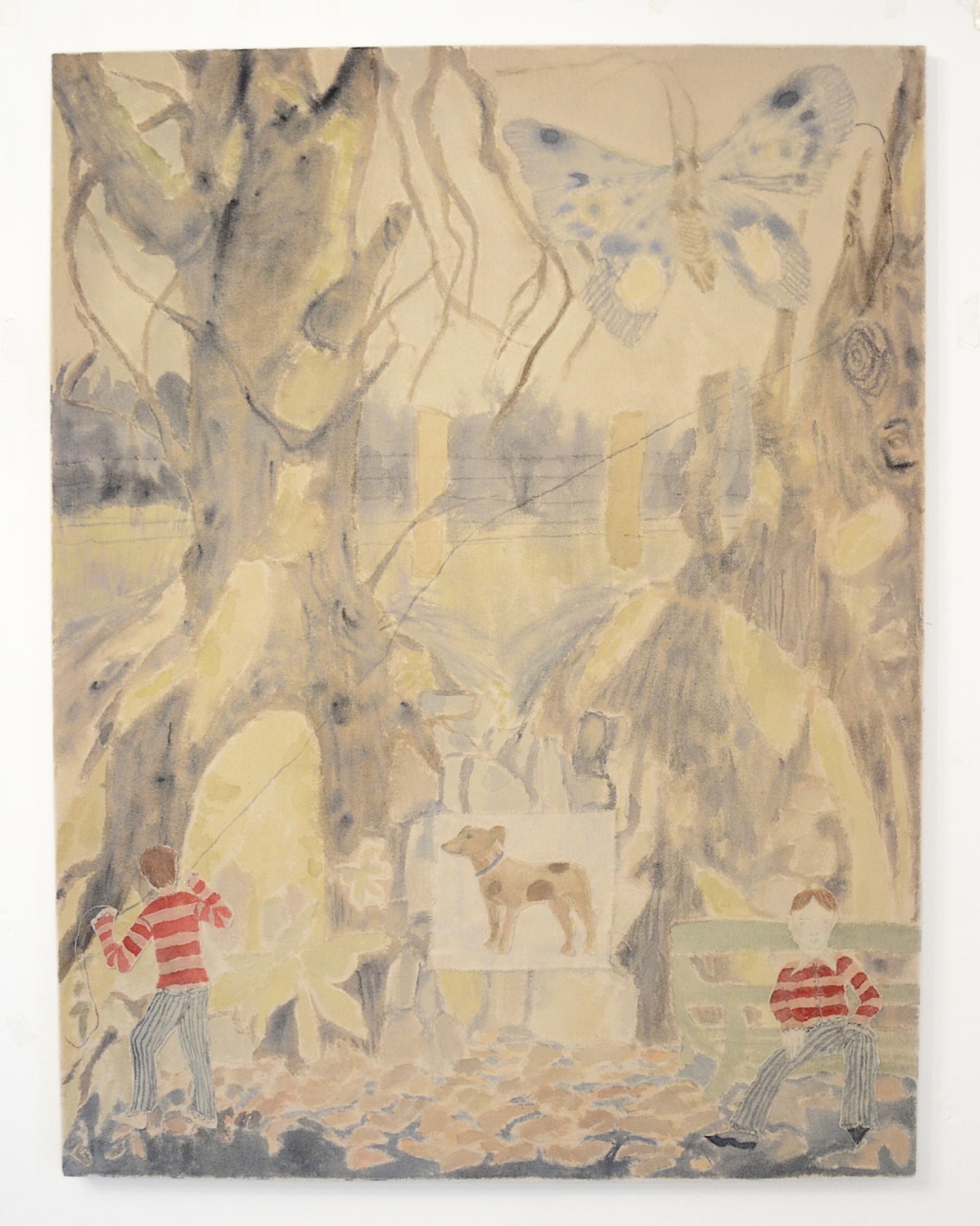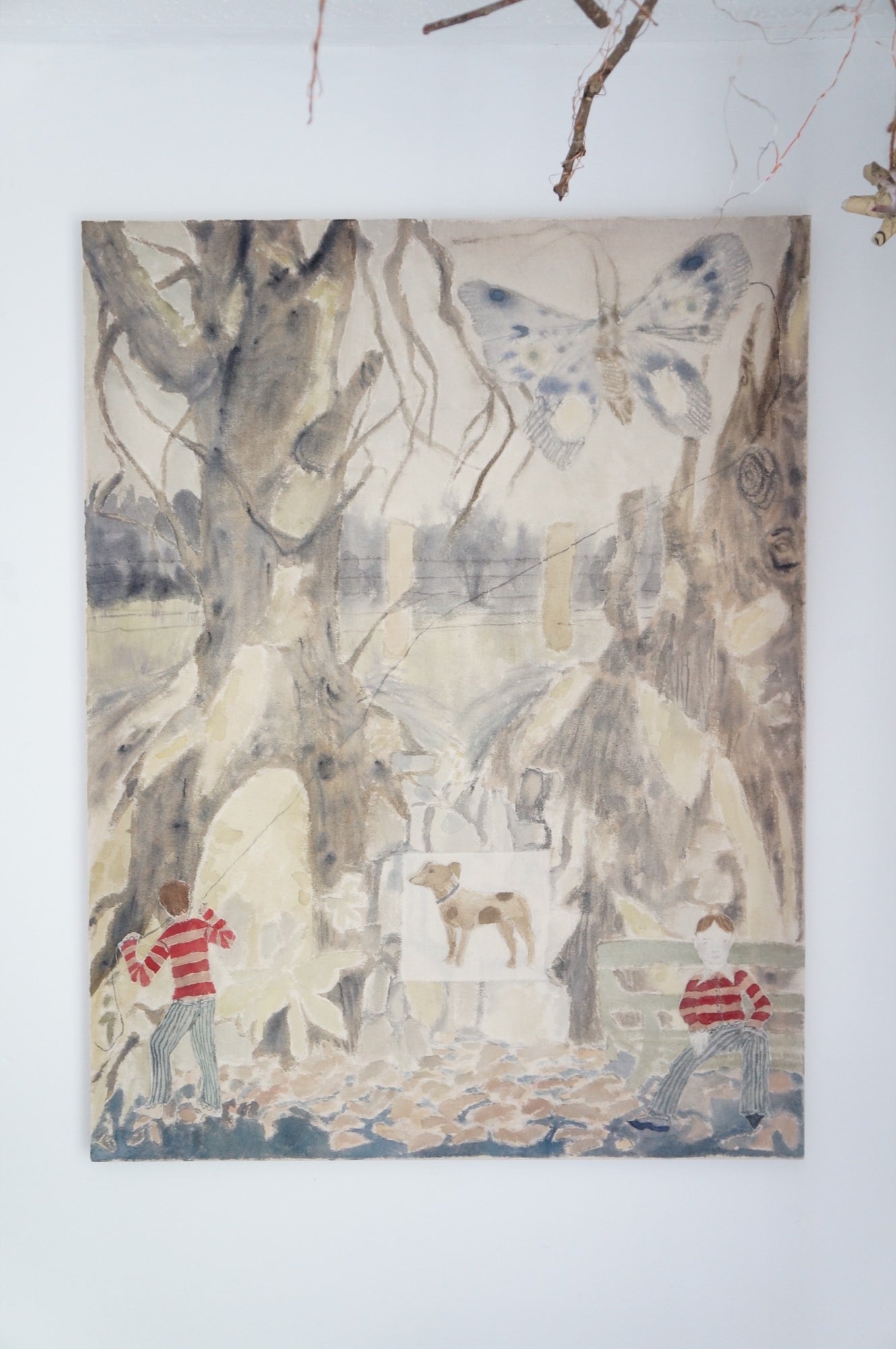 Drawing from queer ecology, magic, and folk tales tied to land justice, anti-war and anti-colonial movements, Bethenie advocates for a 're-enchanting,' 're-wilding' or 're-witching' of land through their work. Often using found materials, they adorn yellowed or worn surfaces with landscapes and animals, processing thoughts about desire and death, and catholicism and animism. Characters such as moths, sheep, chairs, flowers and hillsides often feature in their work.