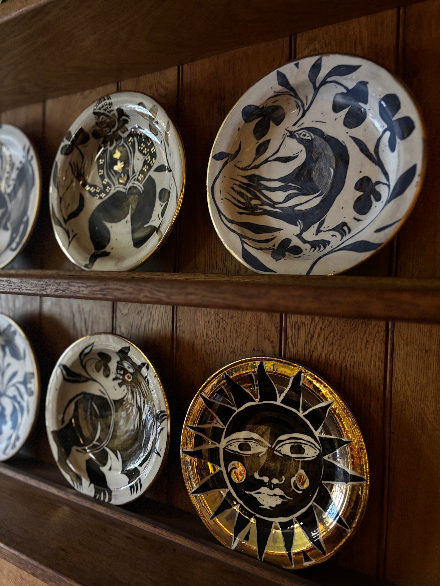 Ceramics and tableware have become the canvas to explore her drawing and ideas upon. Taking inspiration from her inner and surrounding landscape, dreams, poetry, myth, and her experience of being a woman and mother.