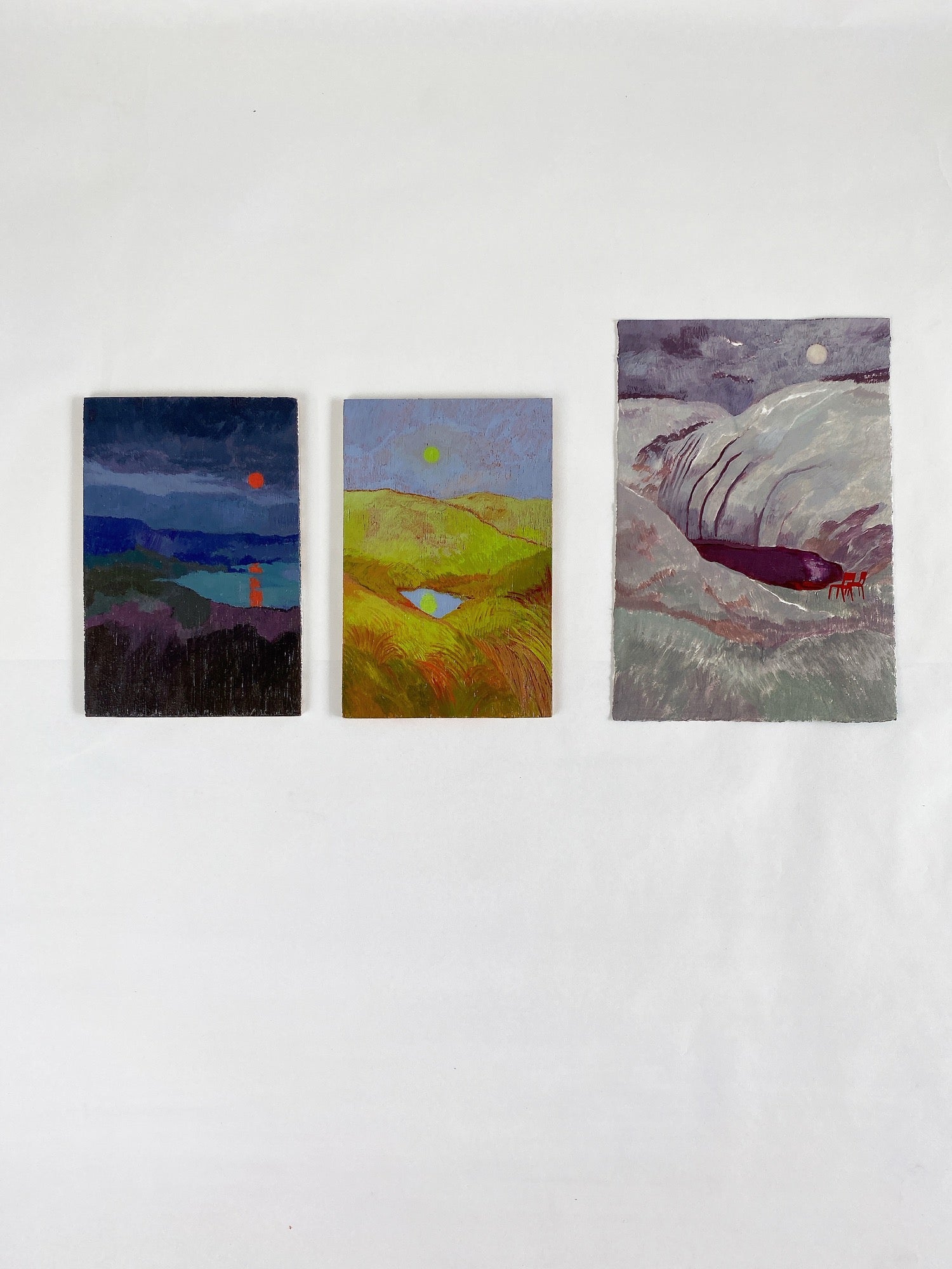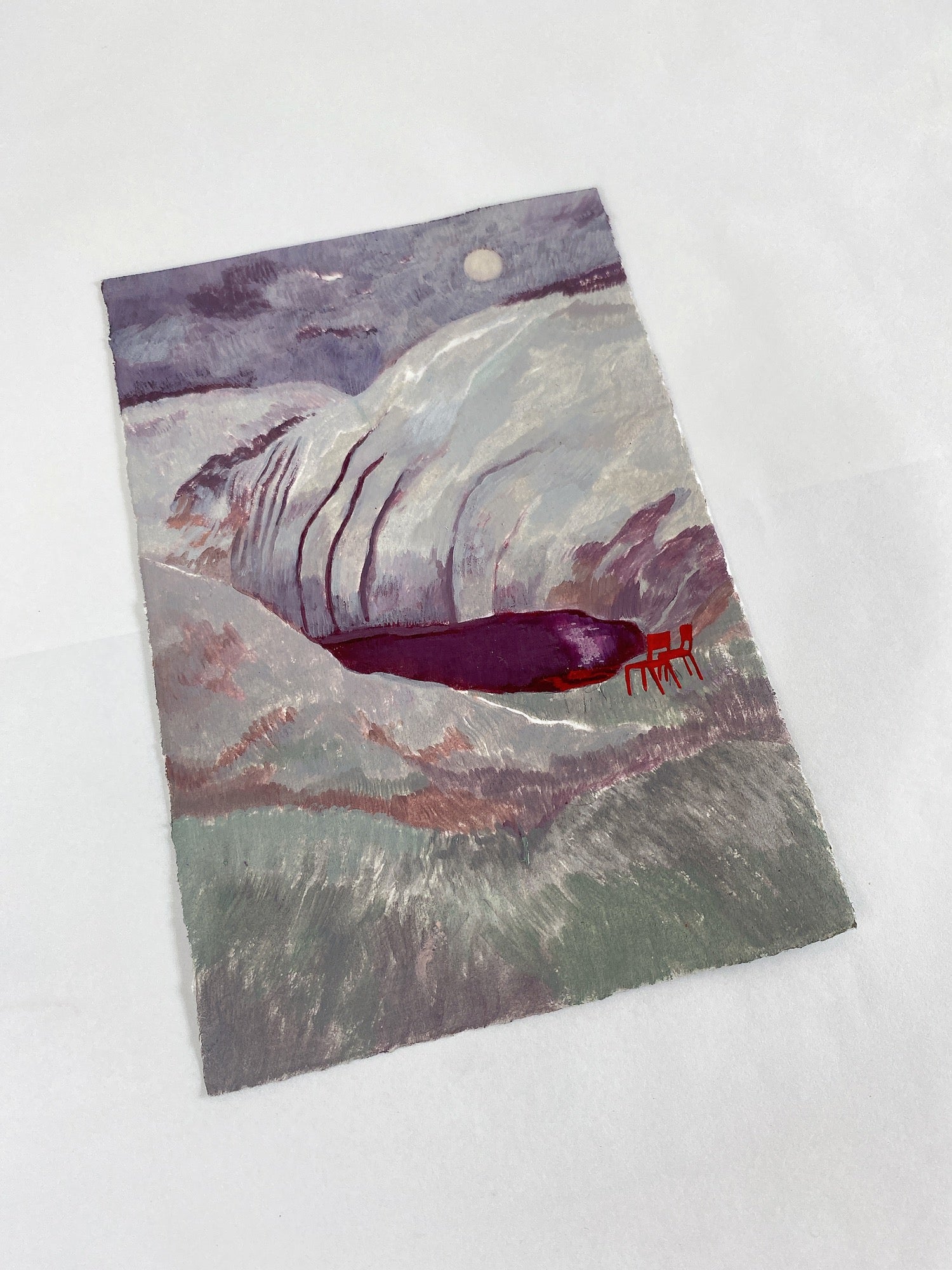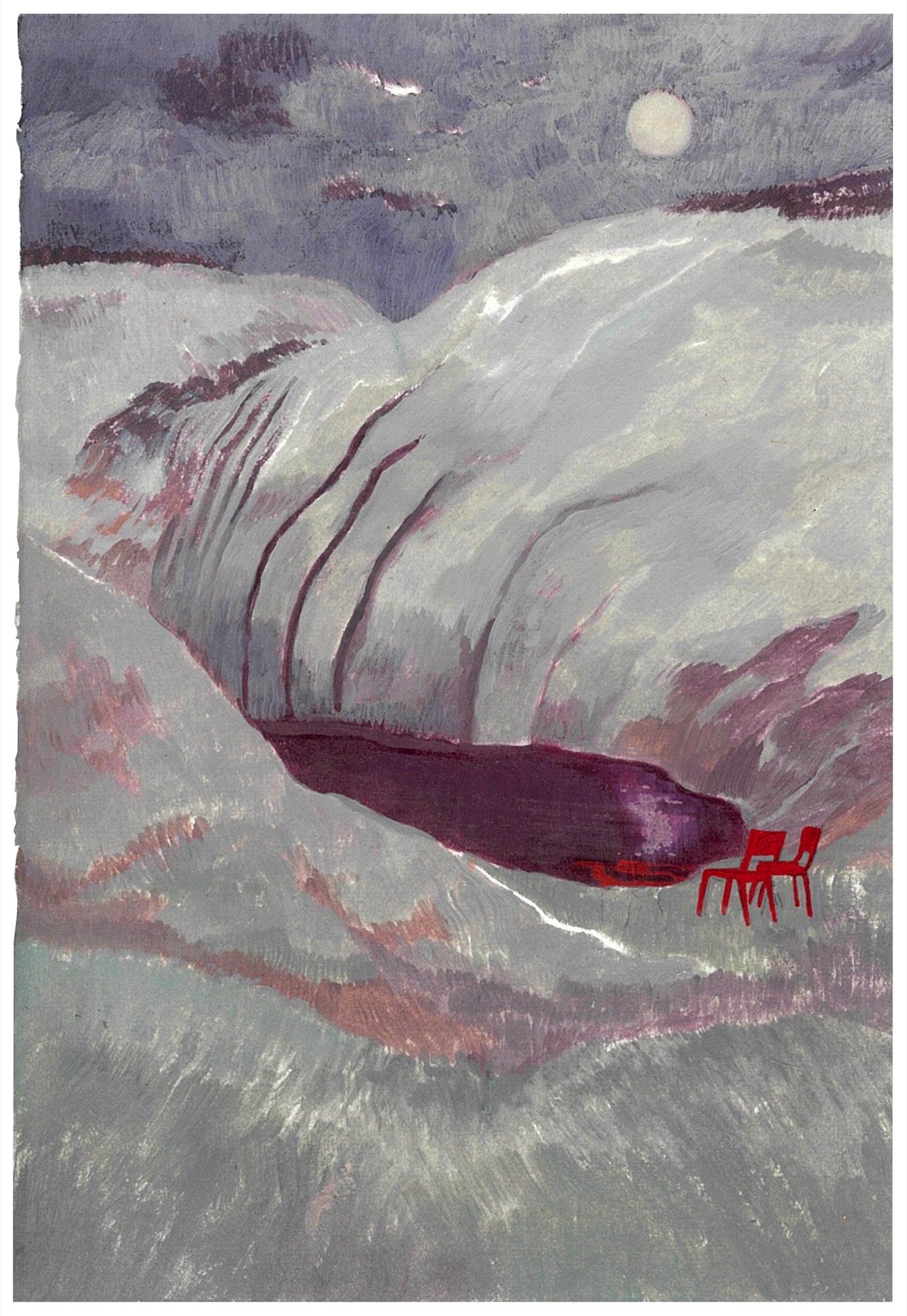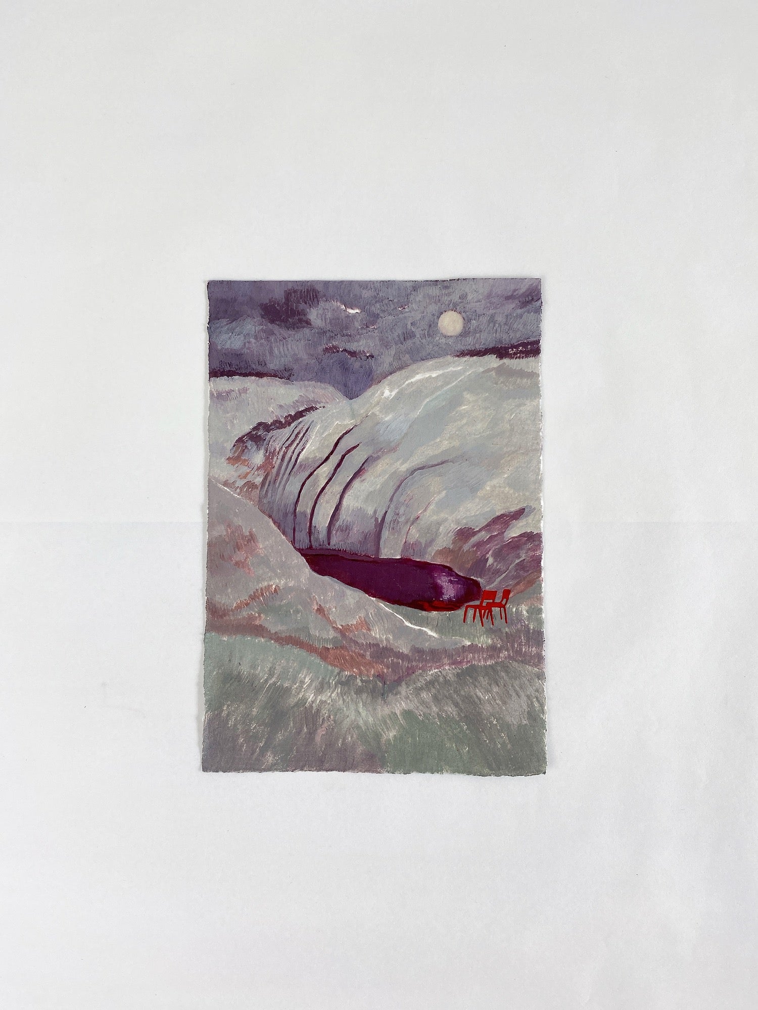 “Nature has always been a muse in my works; the mountain and the sky, the trees and the moon. These elements are frequent collaborators in my exploration. Then comes the chairs, as these new kids on the block. I have piles of baking paper that are dedicated to sketches of chairs. Though I love to capture a setting, a moment, and tones, it also becomes fundamental to infuse a narrative into my work. The imagined narrative is what amused me to explore more into their world." — Ifada Nisa