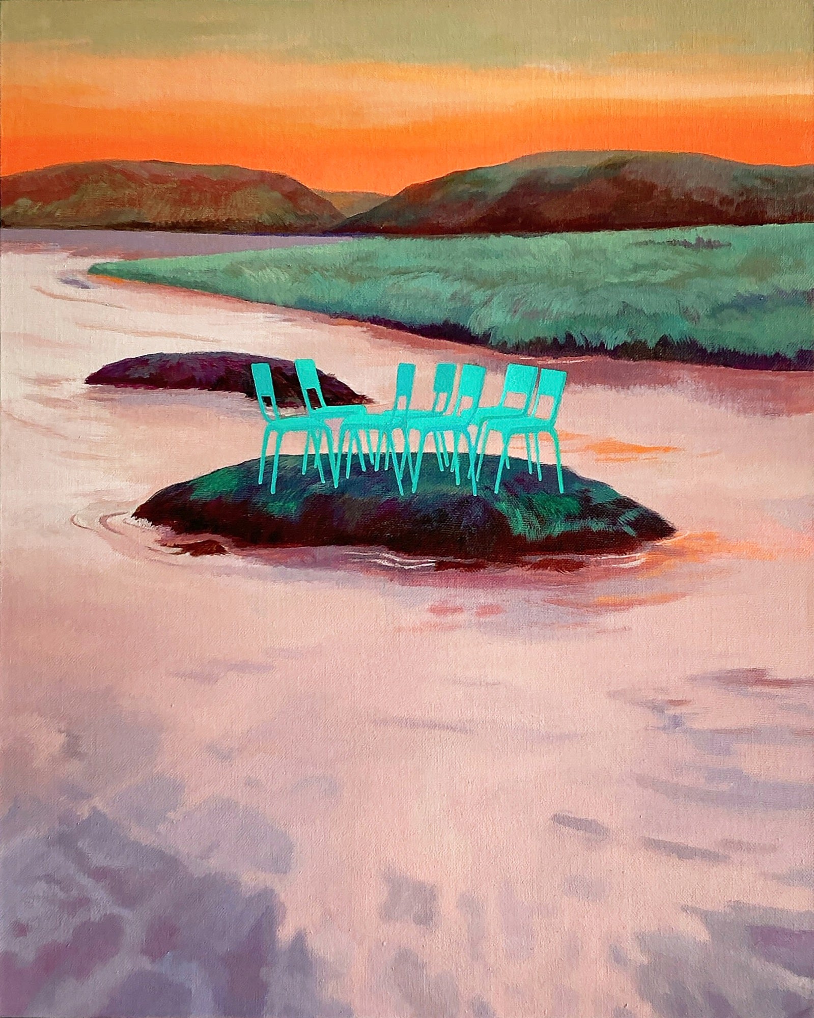 “Nature has always been a muse in my works; the mountain and the sky, the trees and the moon. These elements are frequent collaborators in my exploration. Then comes the chairs, as these new kids on the block. I have piles of baking paper that are dedicated to sketches of chairs. Though I love to capture a setting, a moment, and tones, it also becomes fundamental to infuse a narrative into my work. The imagined narrative is what amused me to explore more into their world." — Ifada Nisa