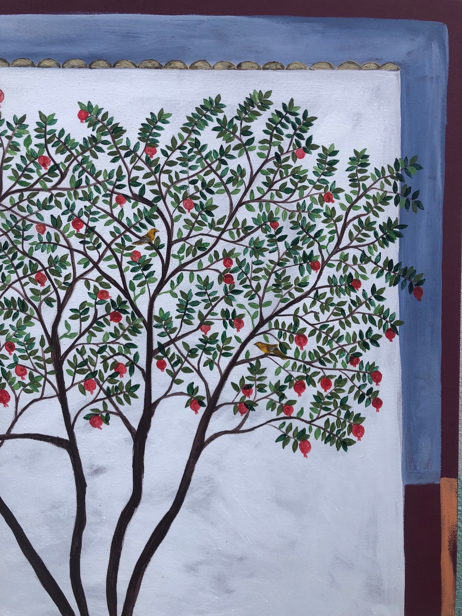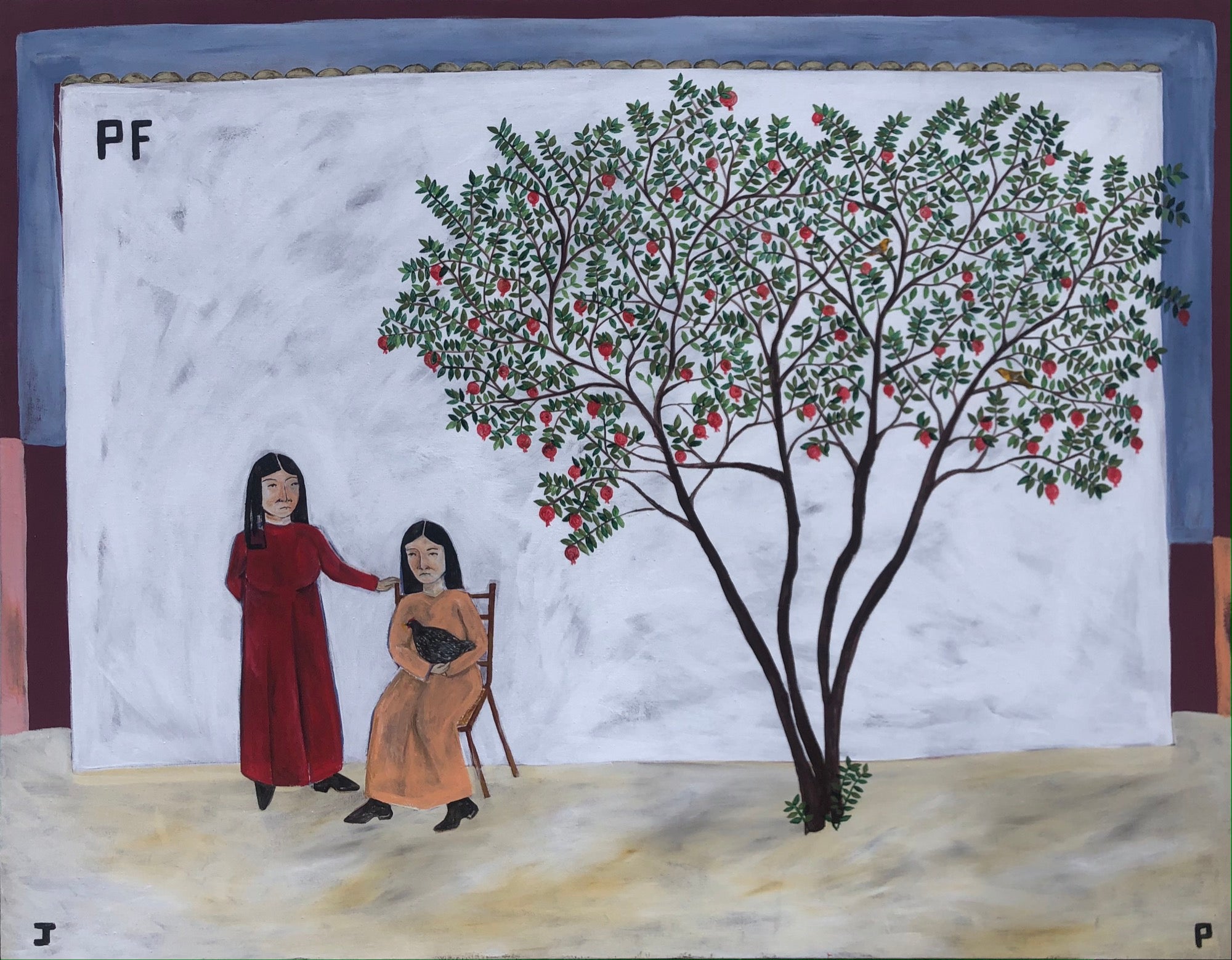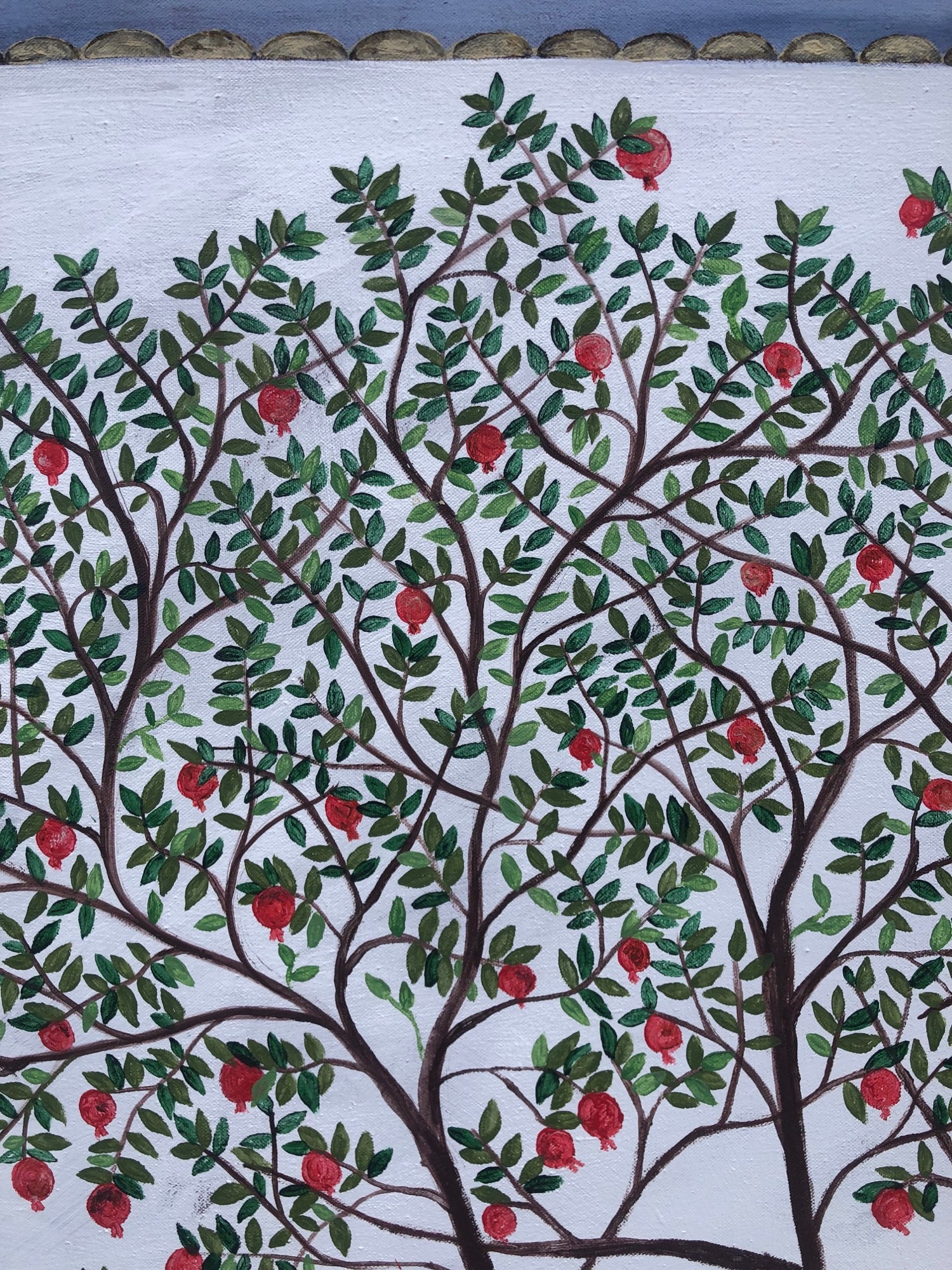 A myriad of abstracted visual references taken from all over the world merge into the painter’s imagined scenes, leaving us with a diverse yet distinctive painted universe, generally void of any factual representation of a certain geographical location or people, rather creating a unique painted universe within itself.