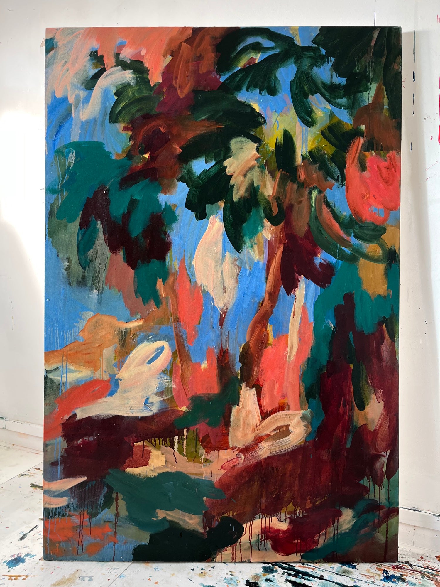 Mary works in oils, allowing the paint to take on a life of its own through chance accidents and gestural mark making. She paints quickly and intuitively, creating a sense of movement while building layers.