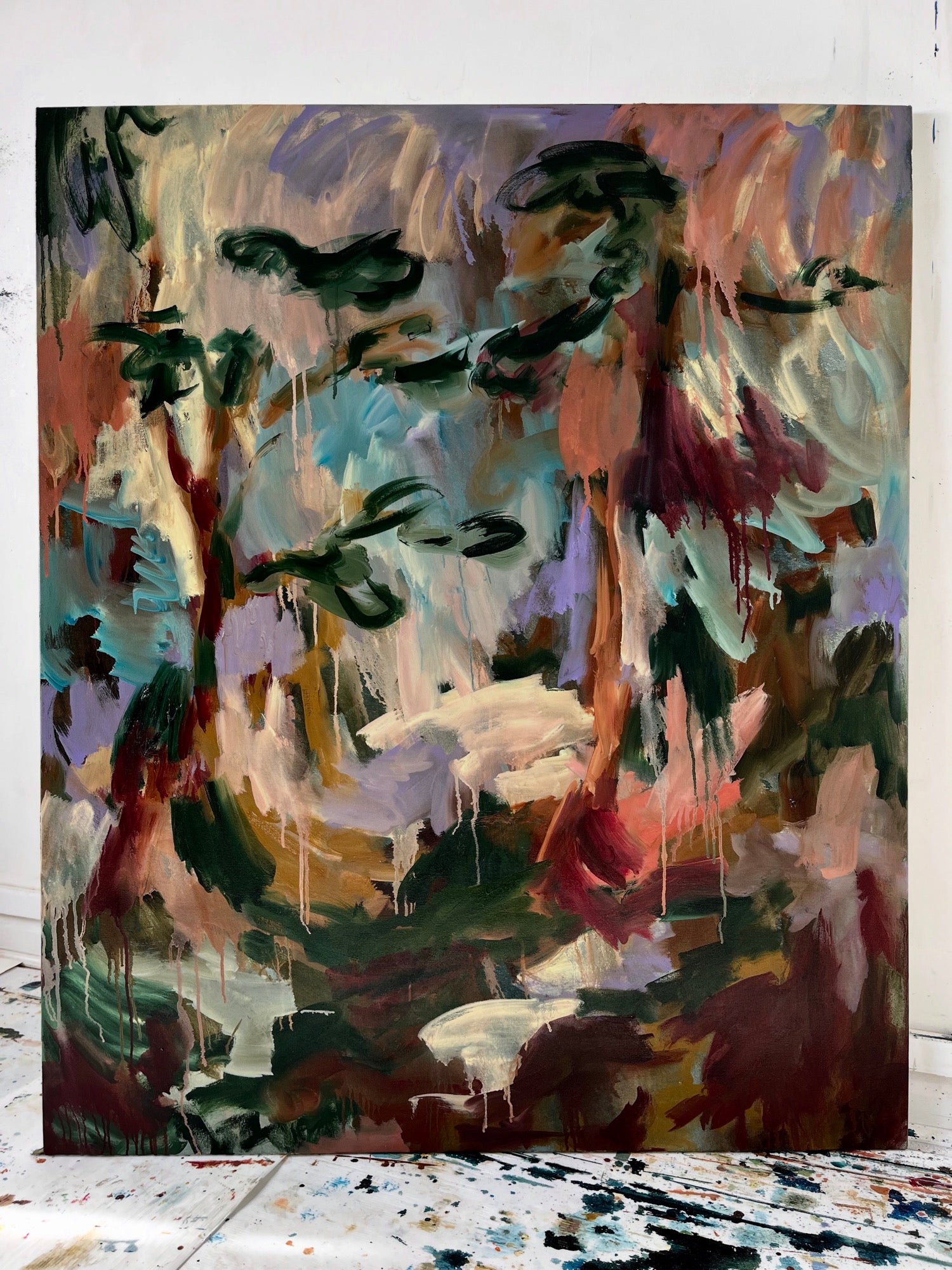 Mary works in oils, allowing the paint to take on a life of its own through chance accidents and gestural mark making. She paints quickly and intuitively, creating a sense of movement while building layers.