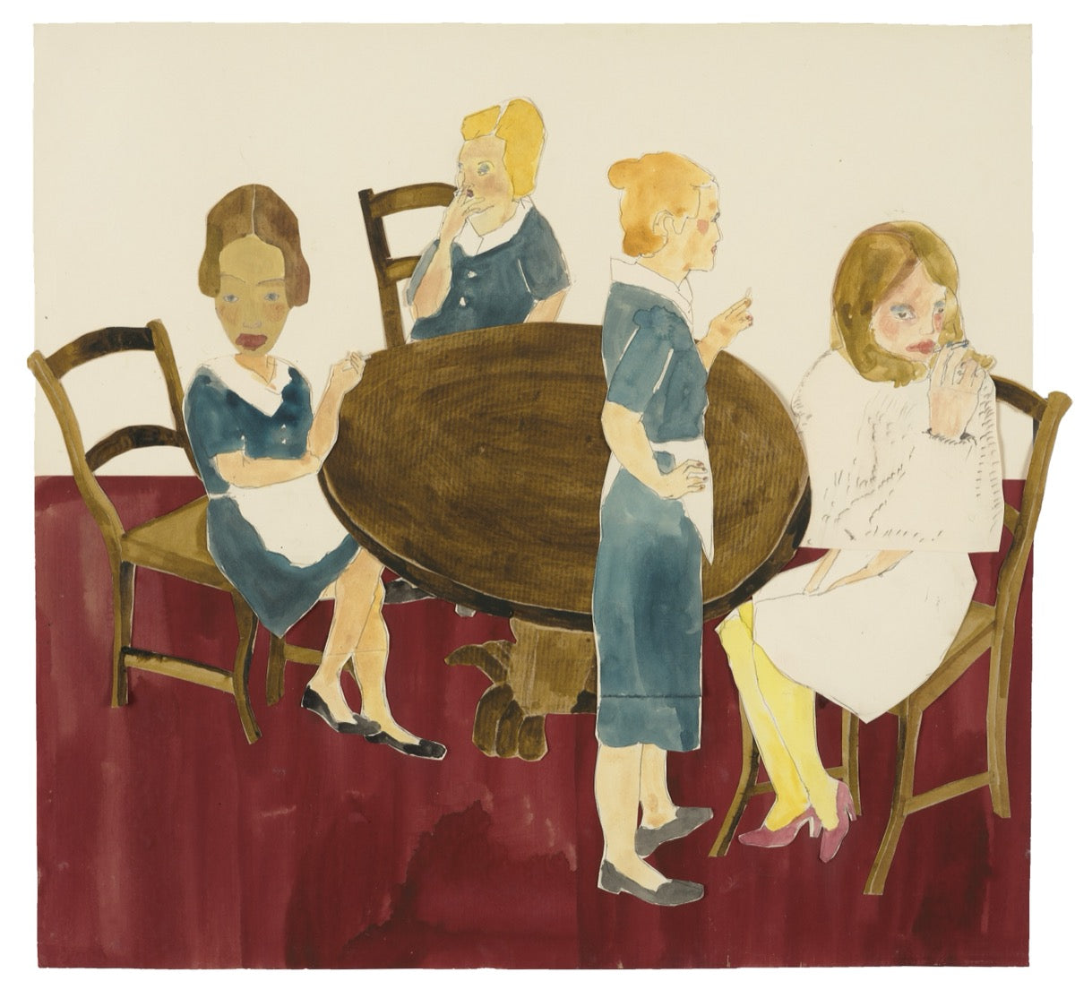 "My practice sits between drawing and collage, where I collect figures, furniture, observations, then piece them together into narratives. This collection grew out of a residency in a hotel, where the characters echo the staff and guests I observed. Drawing on my love of gothic writing, the works hint at a descent beneath the polished surface, as the luxurious facade begins to slip." - Phoebe Howard
