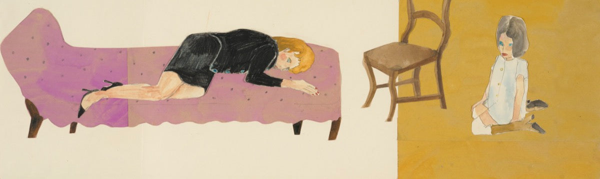 "My practice sits between drawing and collage, where I collect figures, furniture, observations, then piece them together into narratives. This collection grew out of a residency in a hotel, where the characters echo the staff and guests I observed. Drawing on my love of gothic writing, the works hint at a descent beneath the polished surface, as the luxurious facade begins to slip." - Phoebe Howard
