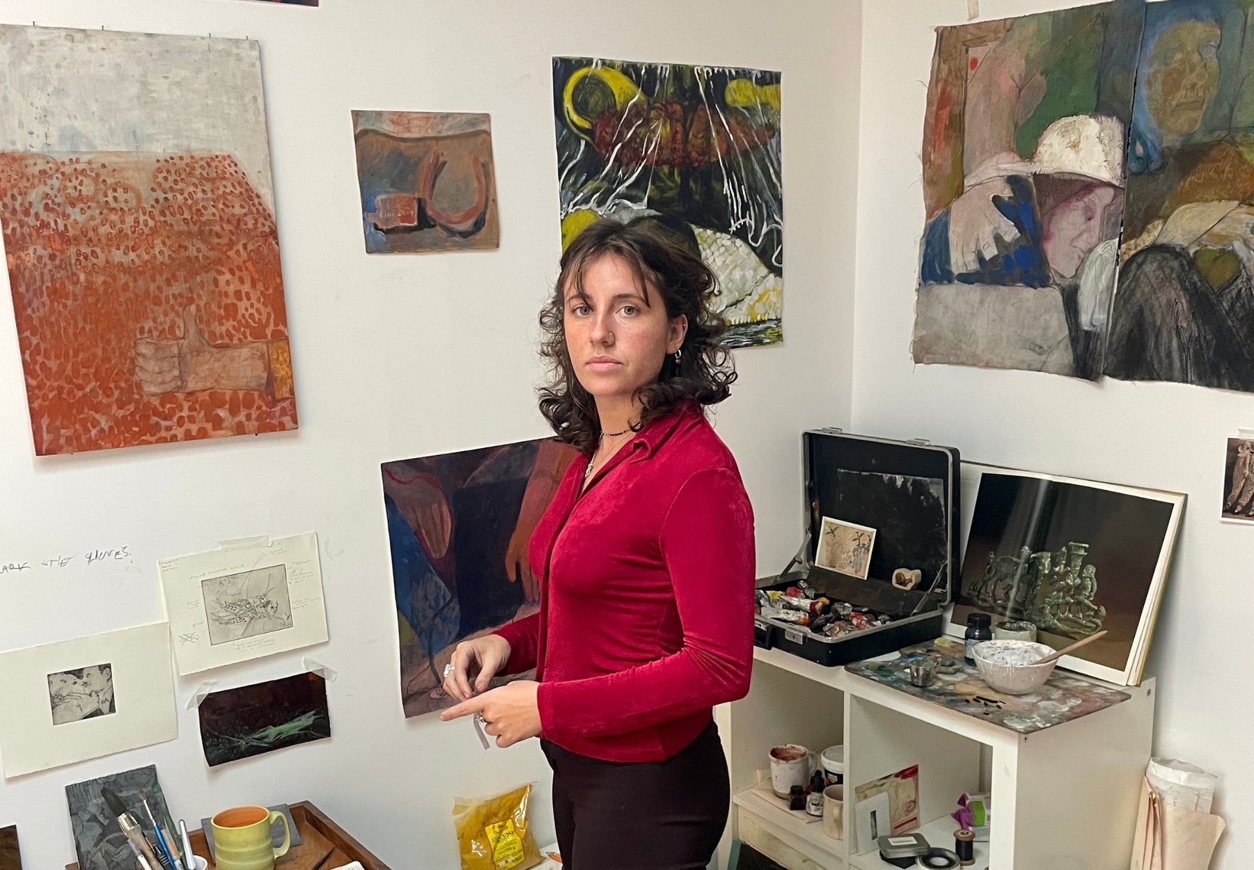 “My practice begins with writing, ink smudges, and drawing. I find comfort in giving life to these fragments - translating them into unexpected yet intimate places. I like to think of myself as a magpie with imagery, gathering accessible symbols that culminate in a narrative-rich world where more waits to be uncovered beneath its surface." - Rebecca Ashton