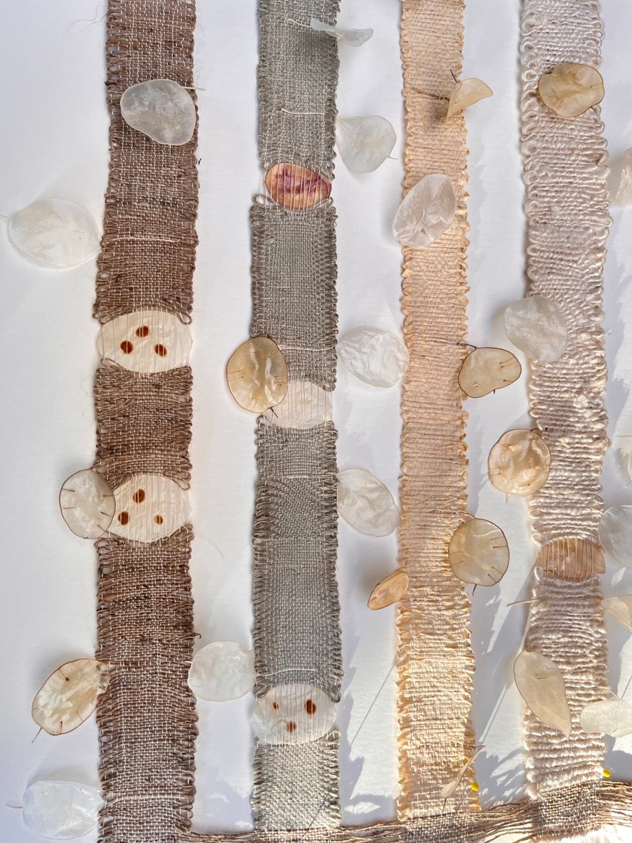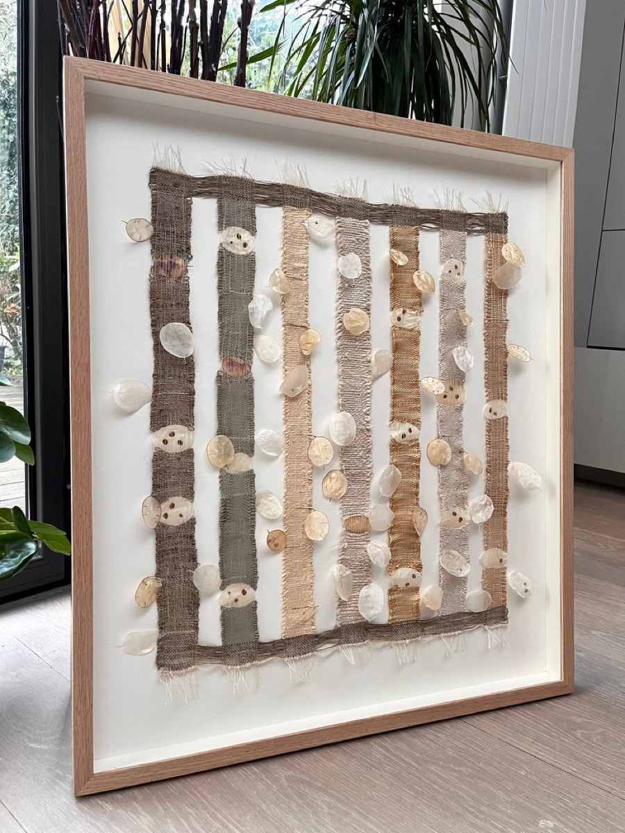 Rachna Garodia is a textile artist based in London. Her intricately woven textures are akin to viewing a landscape, capturing the atmosphere, tone and emotion from her daily walks. Material exploration - bringing unexpected textures together in a warp has always been the starting point for Rachna's work. She juxtaposes cotton, linen, silk, nettle, hemp and wool with found materials like paper, bark, seedpods, twigs etc. All her works are unique and bespoke; each one takes shape slowly in her studio in West London and is later crafted into screens, space dividers and framed textile art.