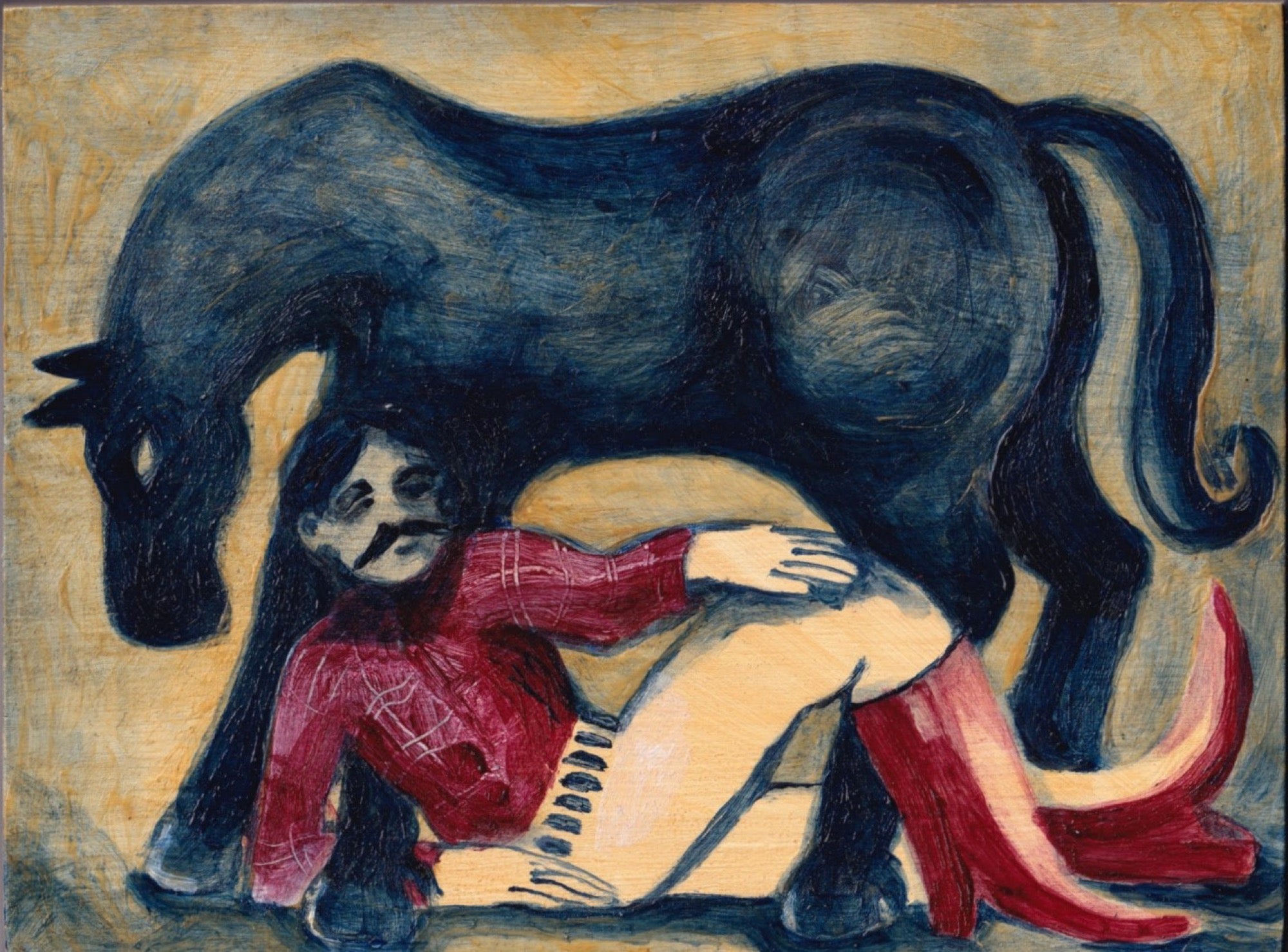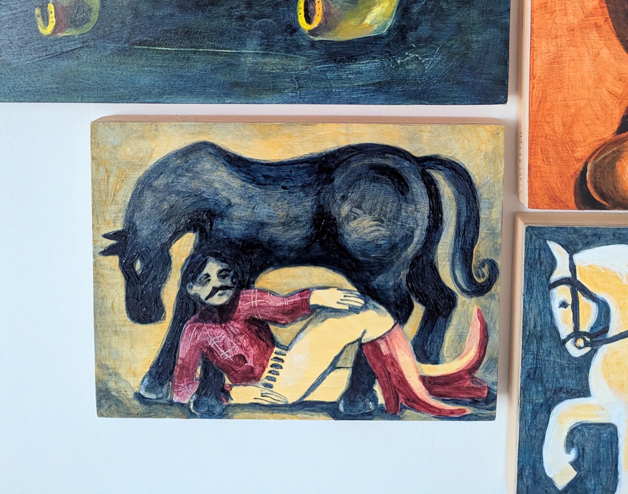 Using bold colours and distorted forms, Alice works from imagination to create a sense of the absurd and a particular kind of playfulness, with the figure of the cowboy often used as a stand-in for herself. Her recent work explores the power of nostalgia in western films, with the cowboy as a romanticisation of loneliness, a nomadic loner who is closer to nature and his horse than to humanity.